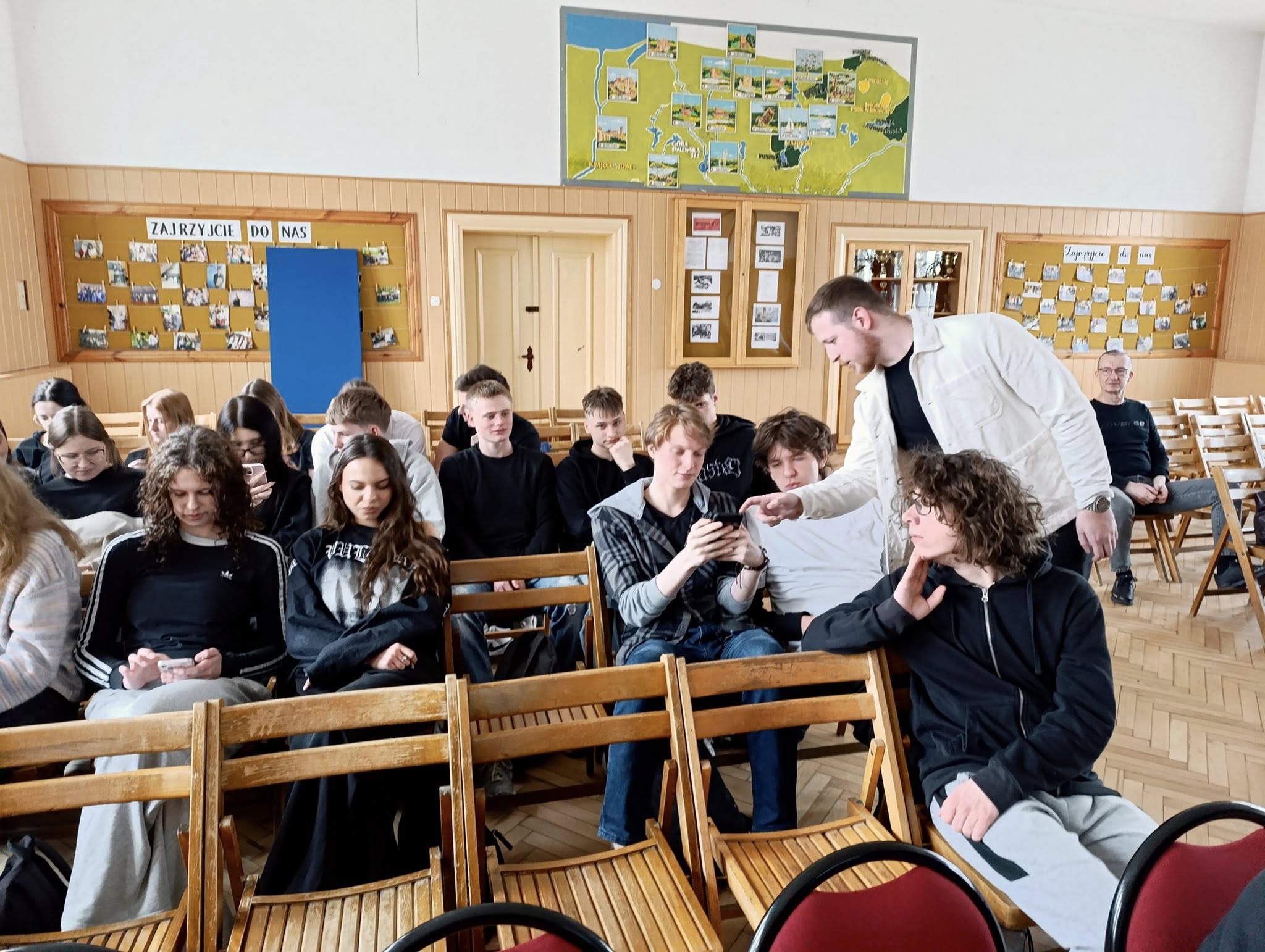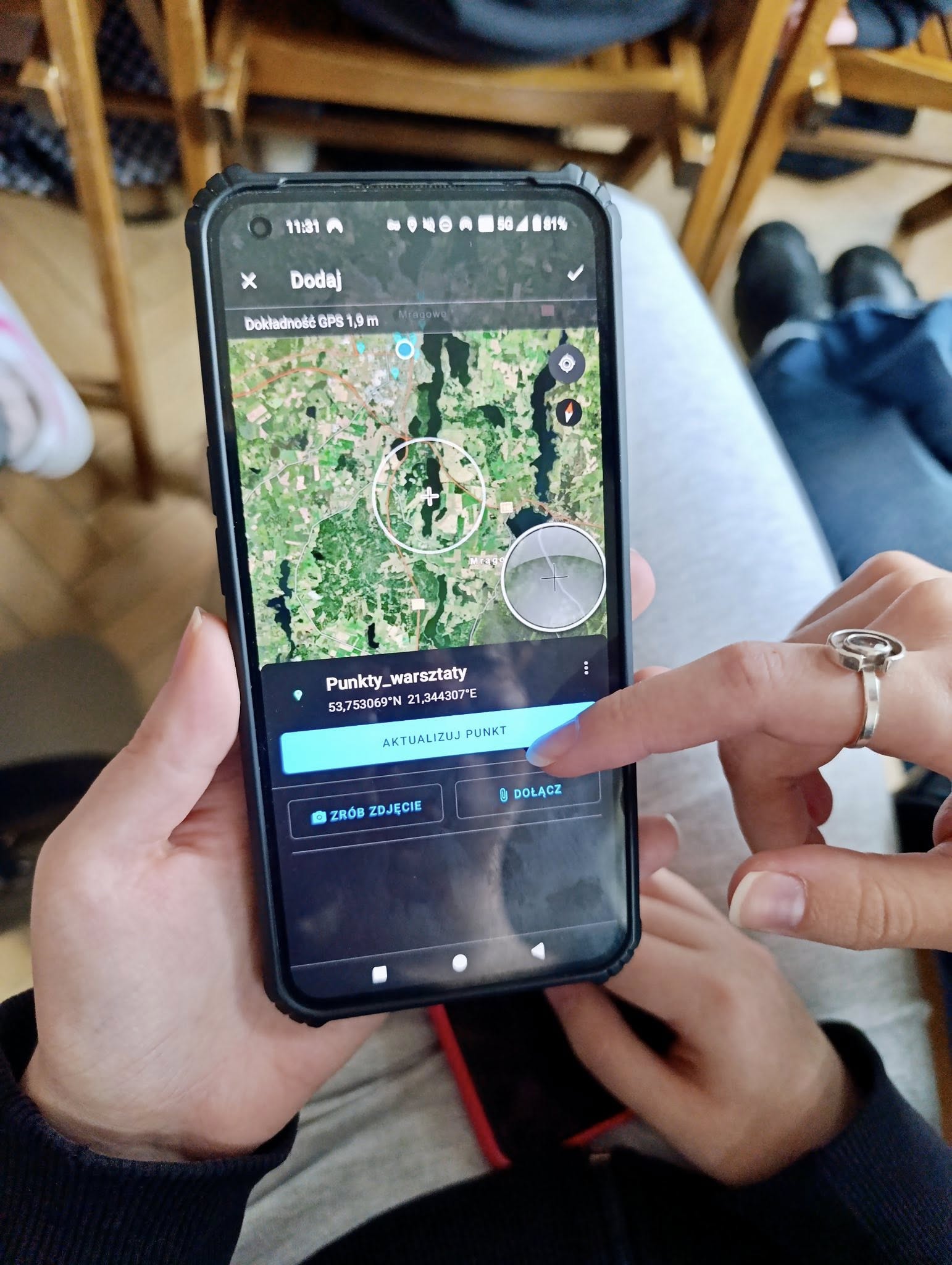 Młodzież w ramach ćwiczenia w specjalnie przygotowanej aplikacji zaznaczała miejsca na mapie Mrągowa, w których lubi spędzać czas wolny. Bardzo dziękujemy panu Bartłomiejowi za spotkanie i przedstawienie narzędzia do tworzenia własnych różnorodnych tematycznie map.