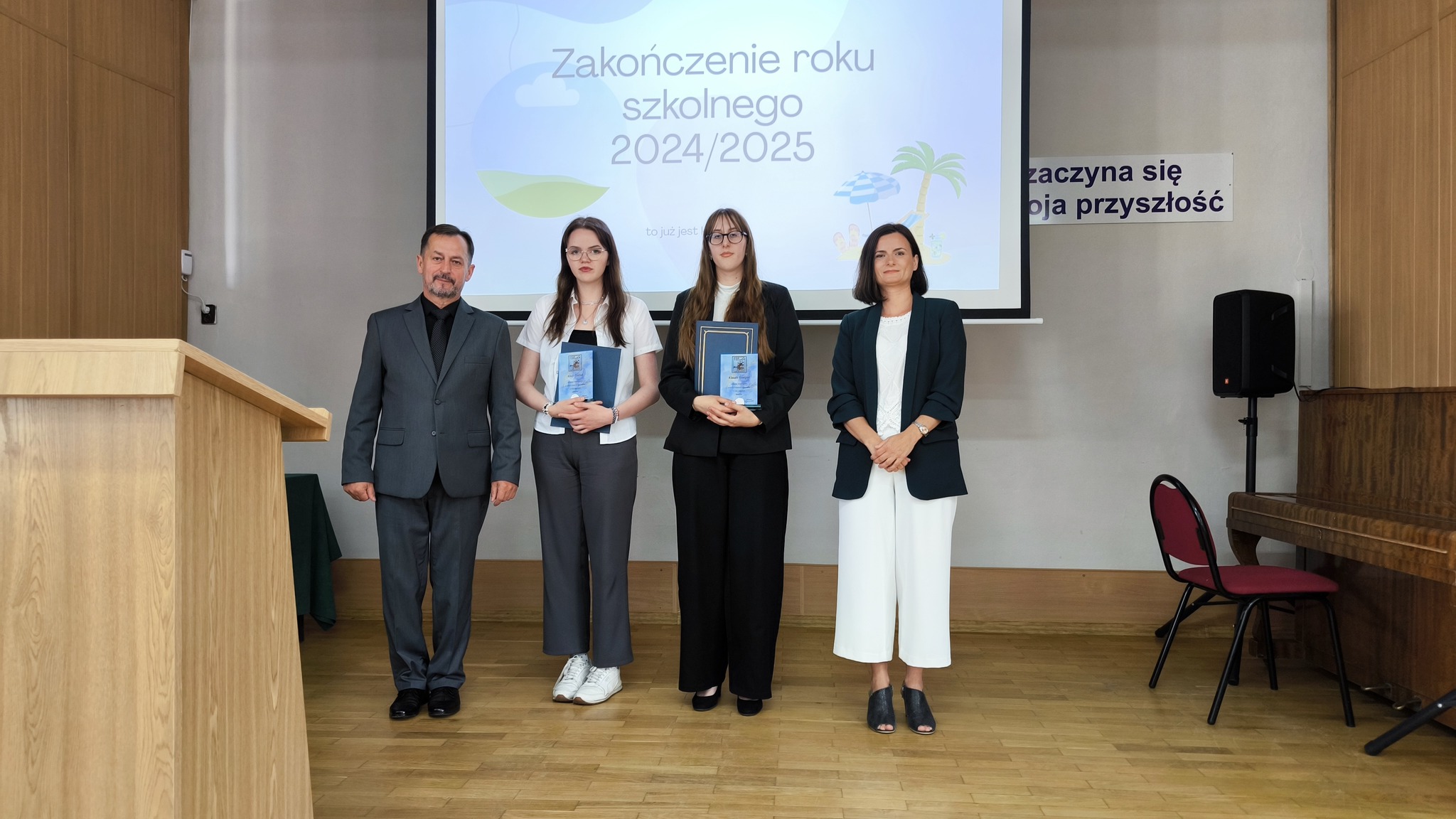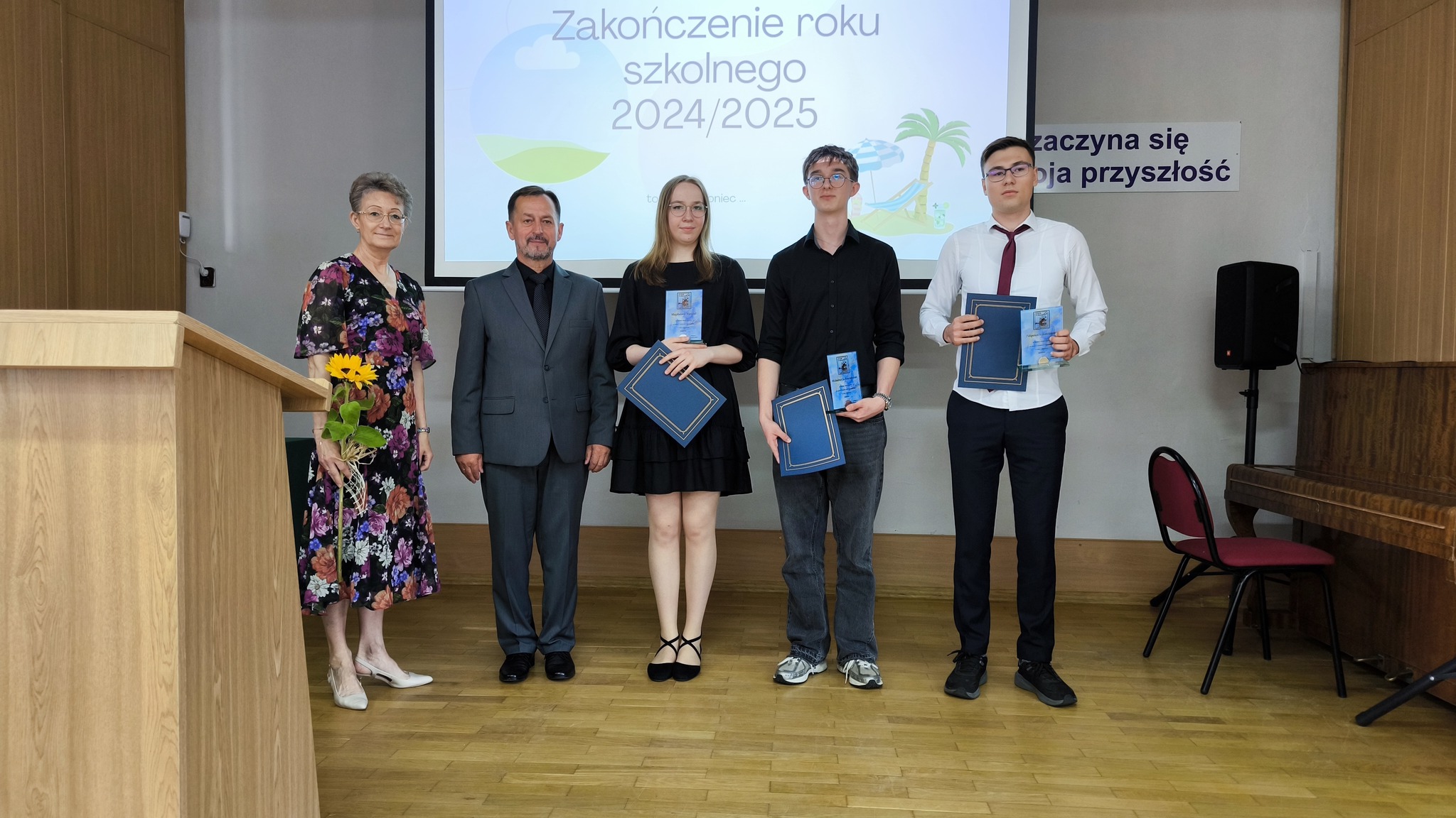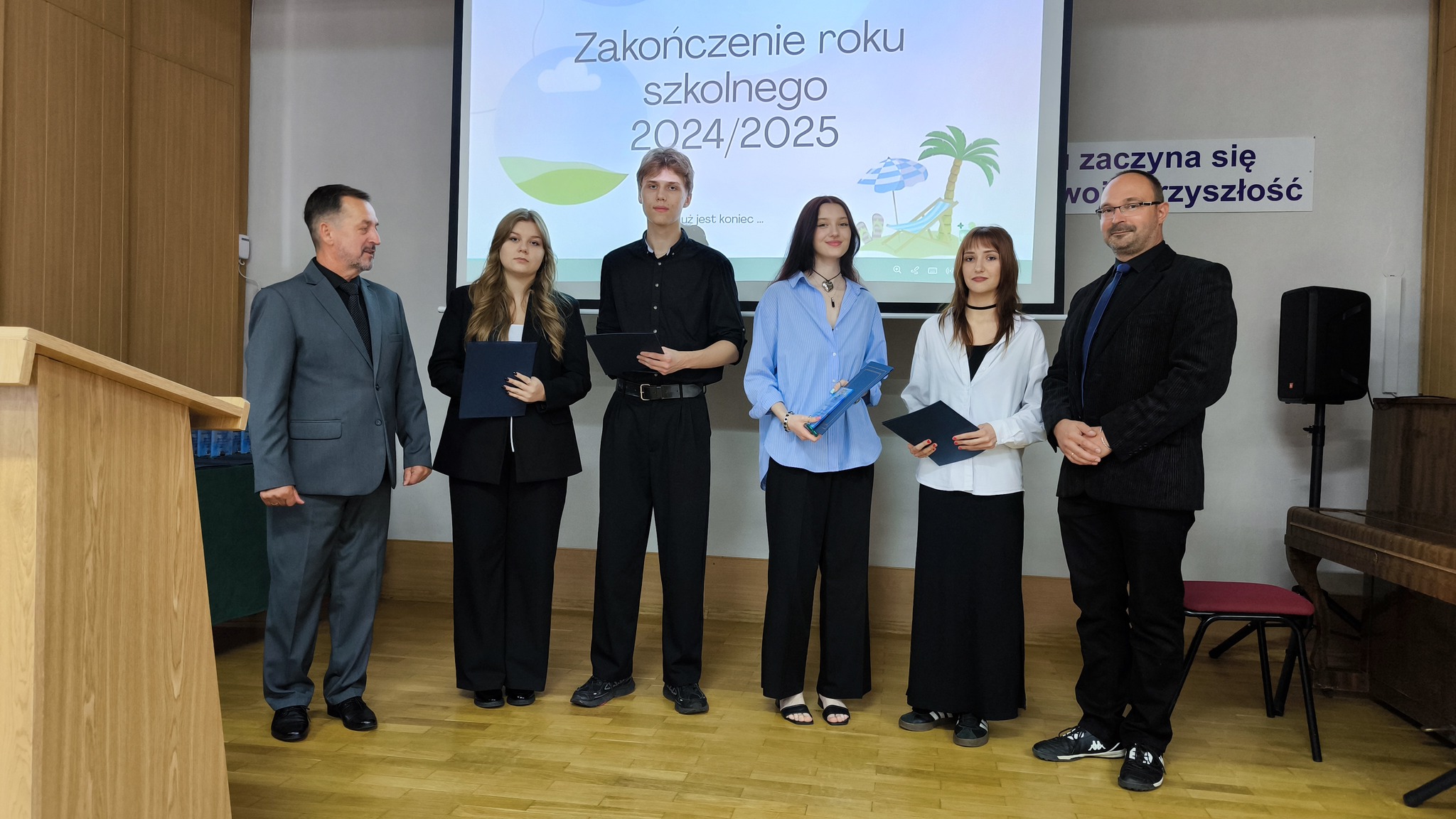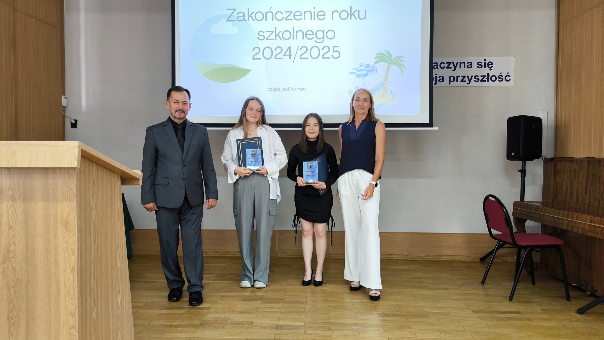 Dziś uroczyście pożegnaliśmy rok szkolny 2024/2025. Podsumowaliśmy minione miesiące nauki a Pan Dyrektor i wychowawcy klas wręczyli świadectwa z wyróżnieniem uczniom, którzy osiągnęli najwyższe wyniki w nauce i zachowaniu. Była to okazja do docenienia ich wysiłku, systematyczności i zaangażowania nie tylko w naukę.