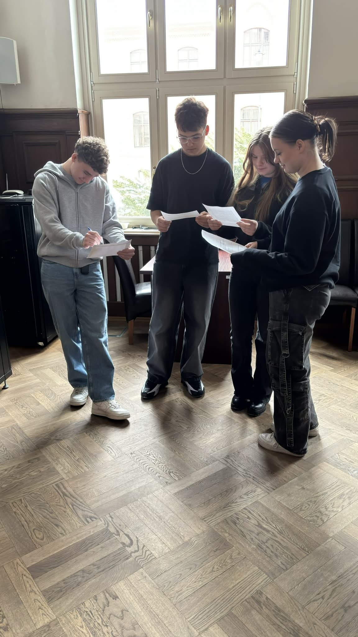 Potem zaczęła się praktyczna lekcja demokracji lokalnej. Członkowie Sztafety, podzieleni na trzy grupy, otrzymali do załatwienia konkretne sprawy w odpowiednich referatach UM. Ale najpierw, w oparciu o przygotowane wcześniej rebusy, musieli te referaty zidentyfikować. Zaczęła się więc gonitwa po Urzędzie. Koniec końców, wszystkie grupy wykonały swoje zadania. Teraz wiedzą jak wypełniać odpowiednie wnioski i formularze, jak szeroki jest zakres działalności samorządu gminnego. Dzięki tej praktycznej lekcji demokracji lokalnej będzie im, w przyszłości, łatwiej odnaleźć się w gąszczu przepisów i urzędowych formalności.