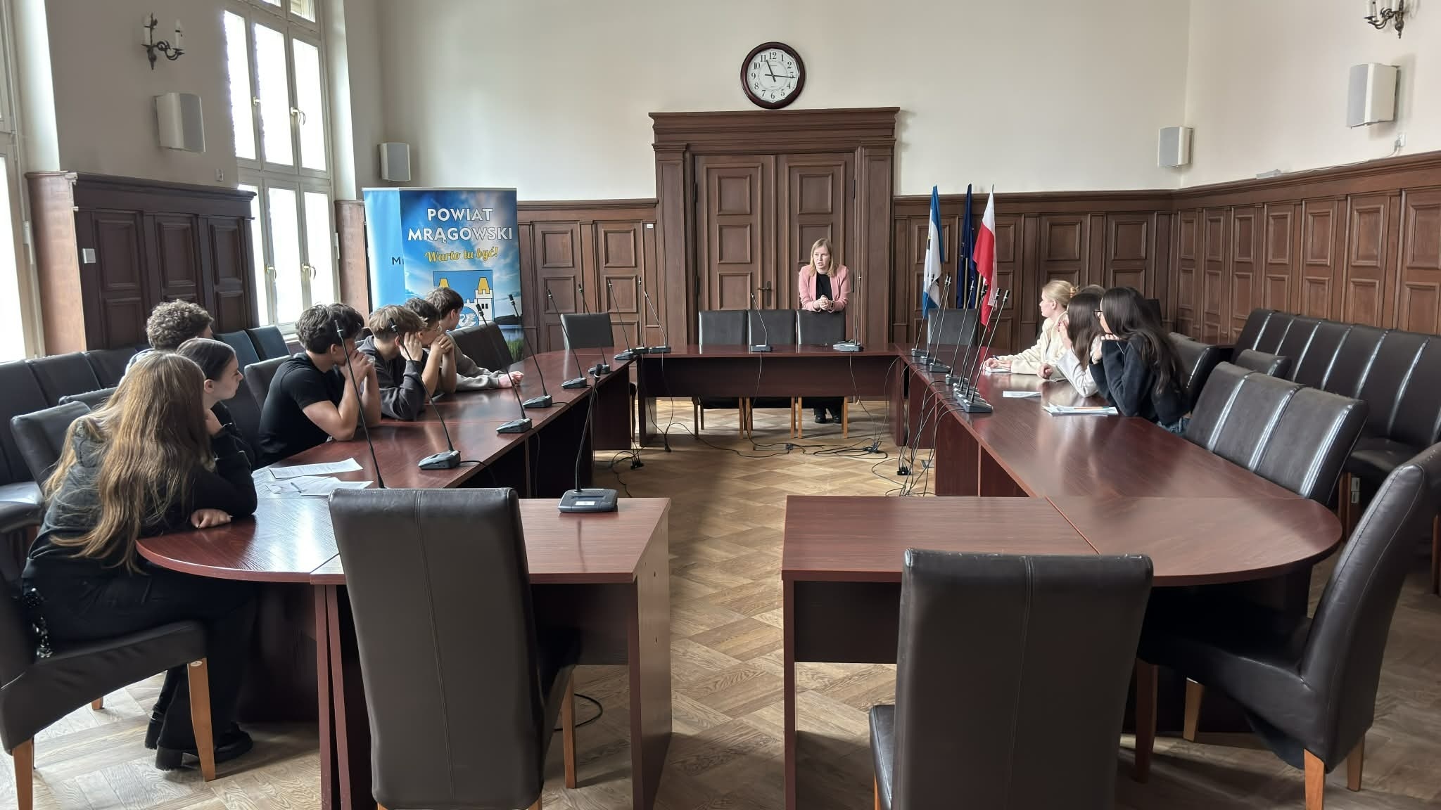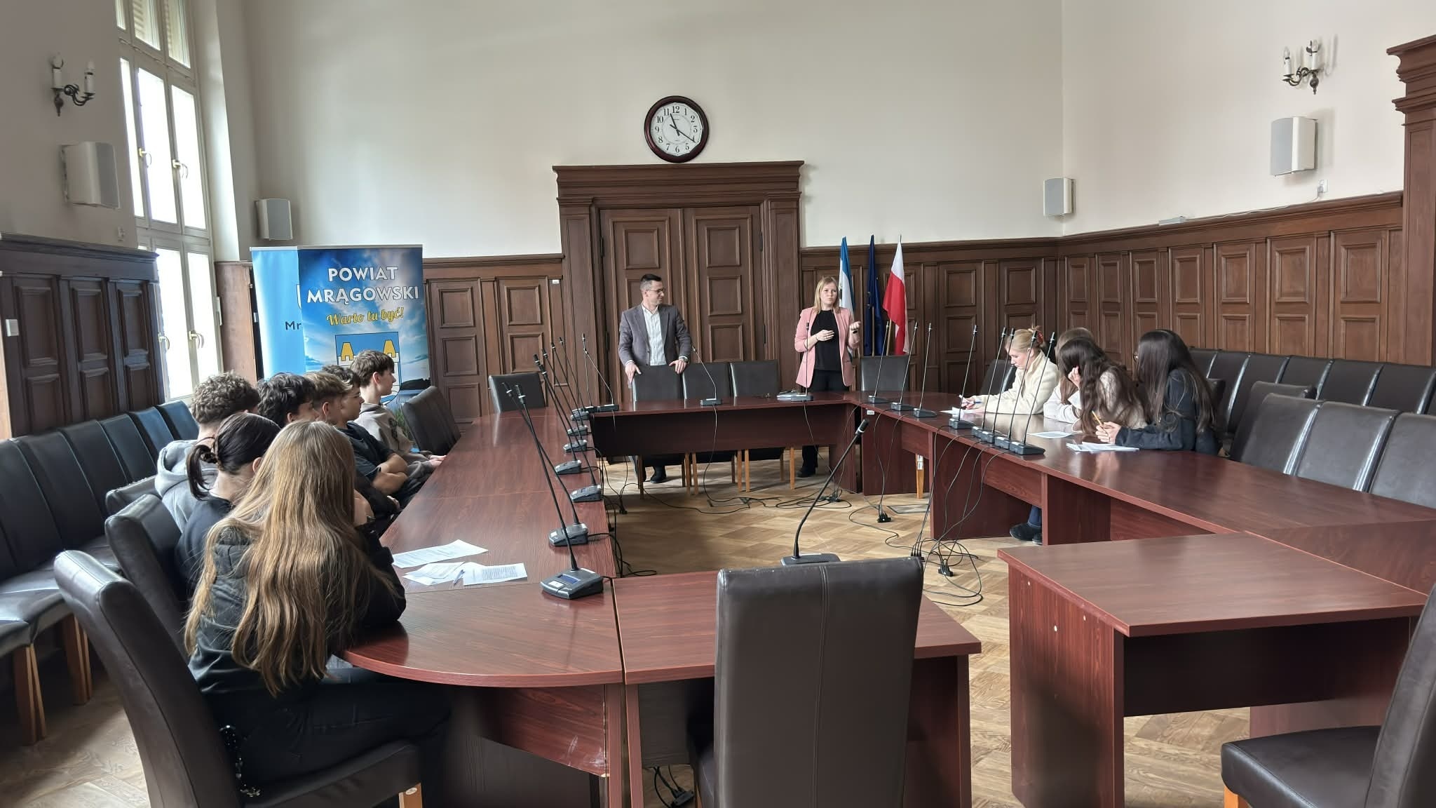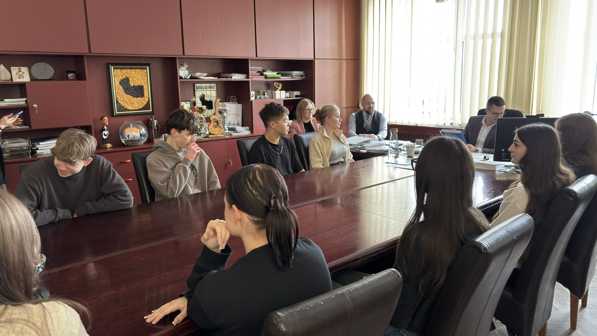 17 lutego 2026 roku Sztafeta Demokracji, działająca w ramach Sztafety Pokoleń, odwiedziła Urząd Miasta w Mrągowie. Celem wizyty było poznanie, od podszewki, struktury Urzędu oraz zakresu jego działalności. Pan Burmistrz Jakub Doraczyński, razem ze swoim zastępcą Kamilem Turowskim, przyjął nas w swoim gabinecie. Rozmowa na temat problemów miasta i planów jego rozwoju trwała około godziny.