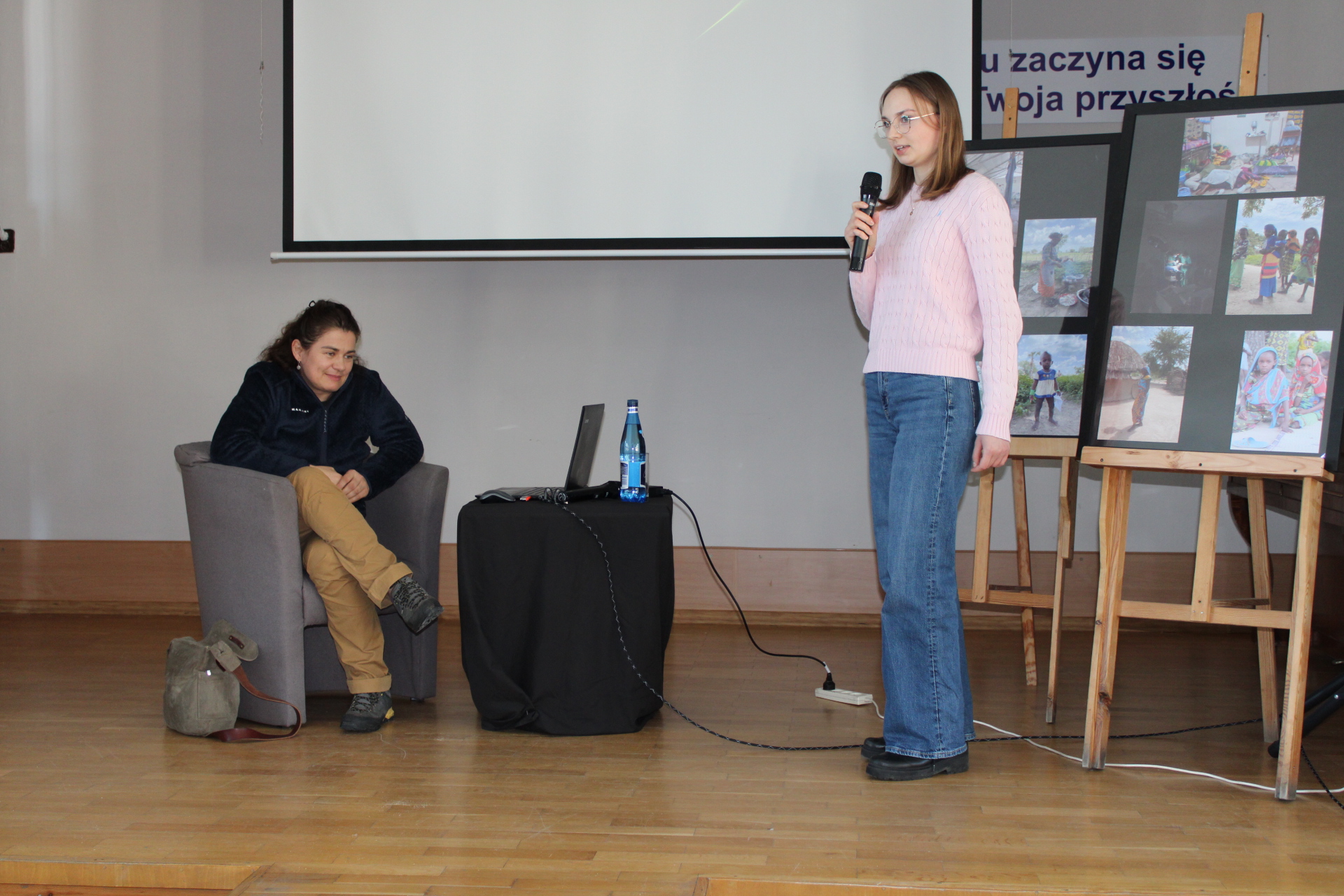 Podczas spotkania Pani Doktor opowiedziała o swojej pracy w Czadzie. Uczniowie mieli okazję dowiedzieć się, jak wygląda codzienność lekarza pracującego w trudnych warunkach klimatycznych i organizacyjnych, z jakimi wyzwaniami trzeba się mierzyć oraz jak ogromne znaczenie ma pomoc medyczna w regionach dotkniętych ubóstwem i ograniczonym dostępem do opieki zdrowotnej.