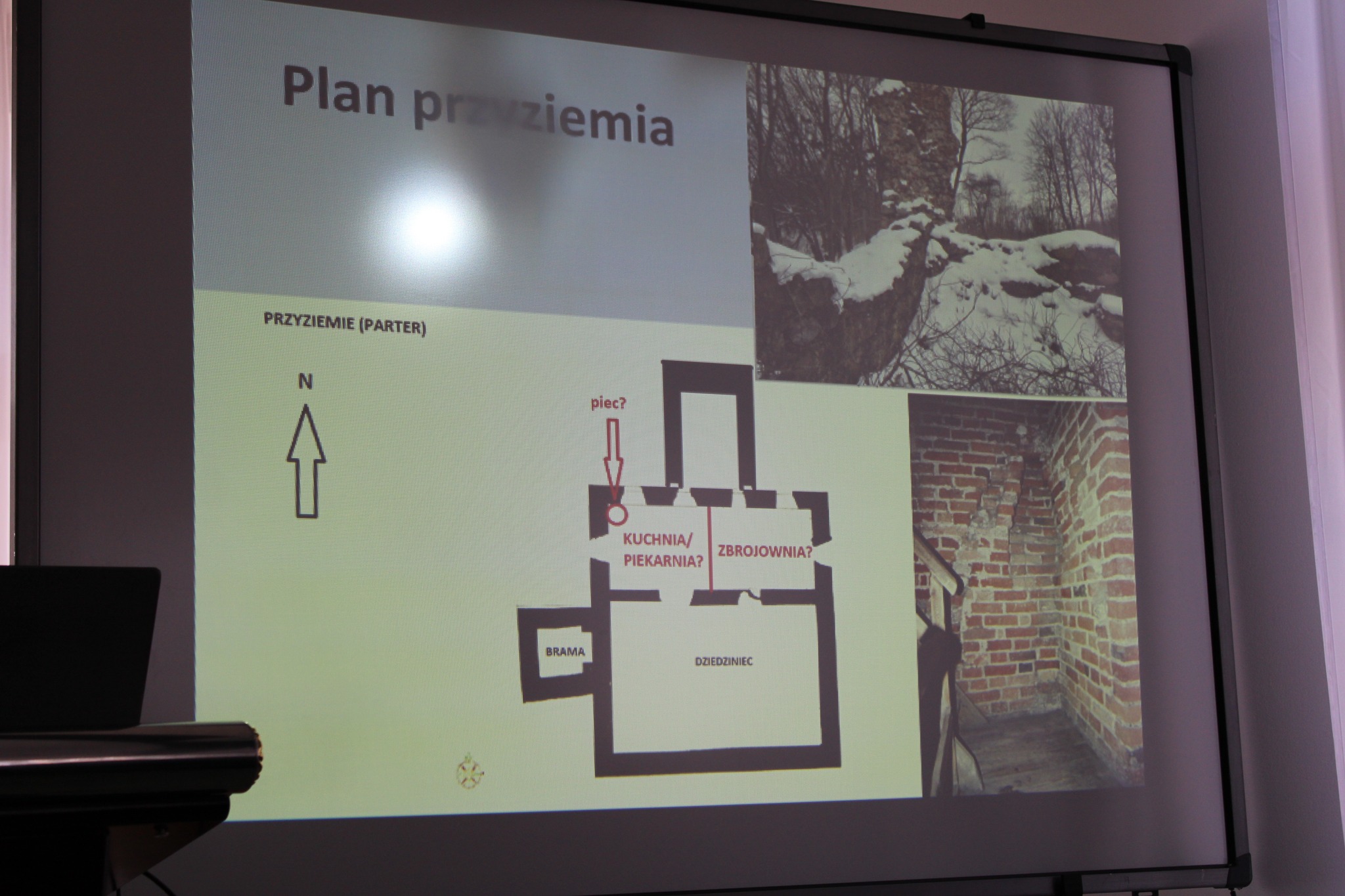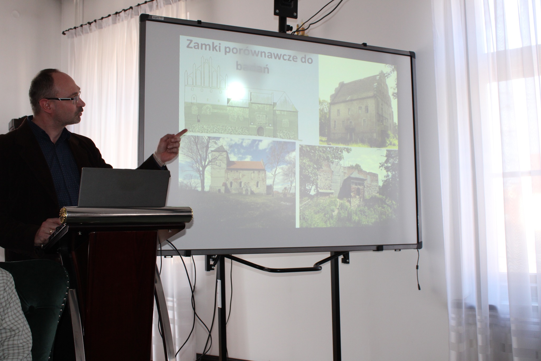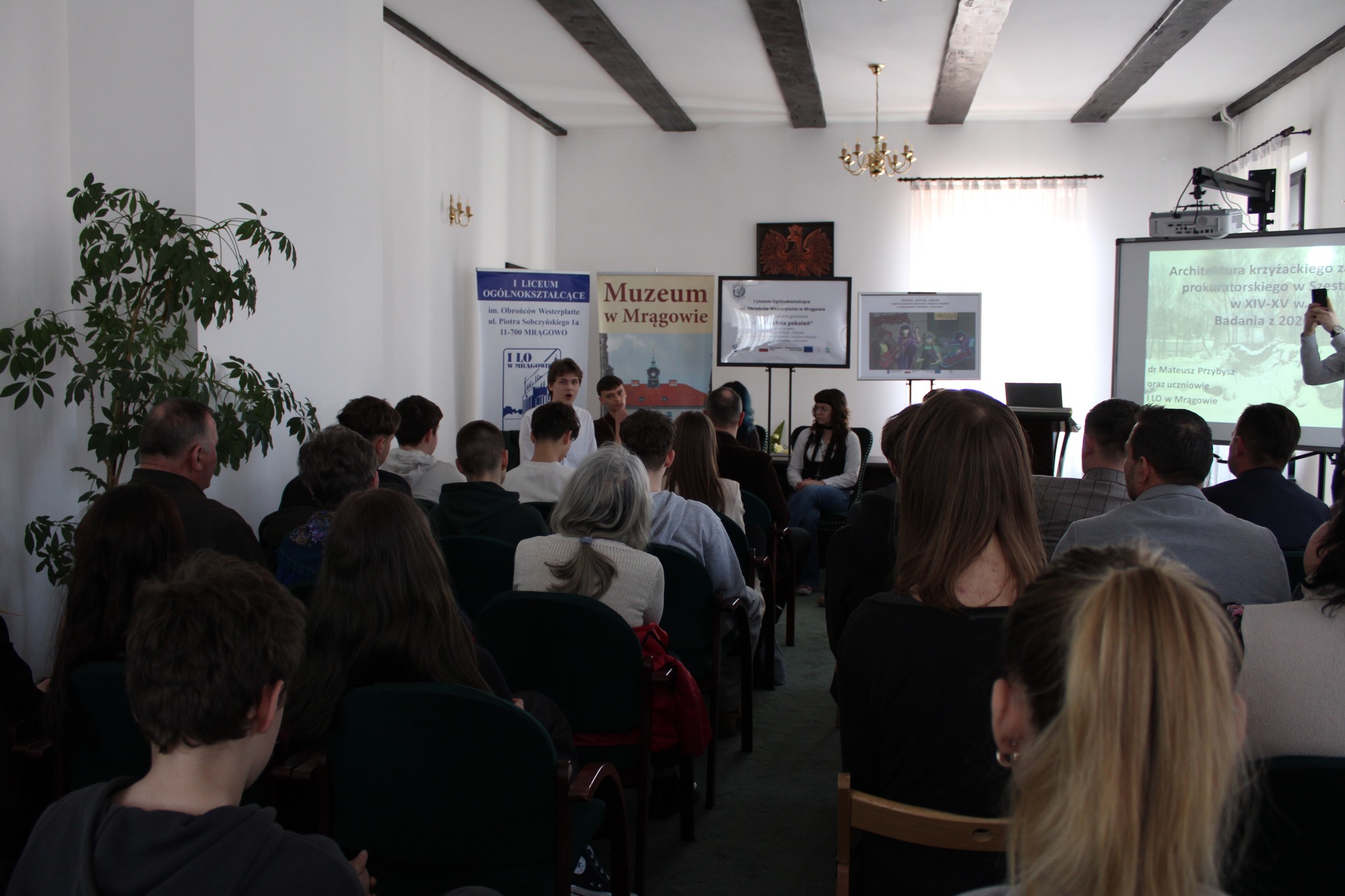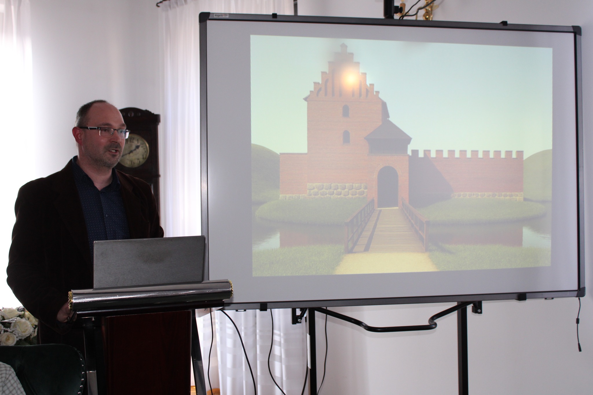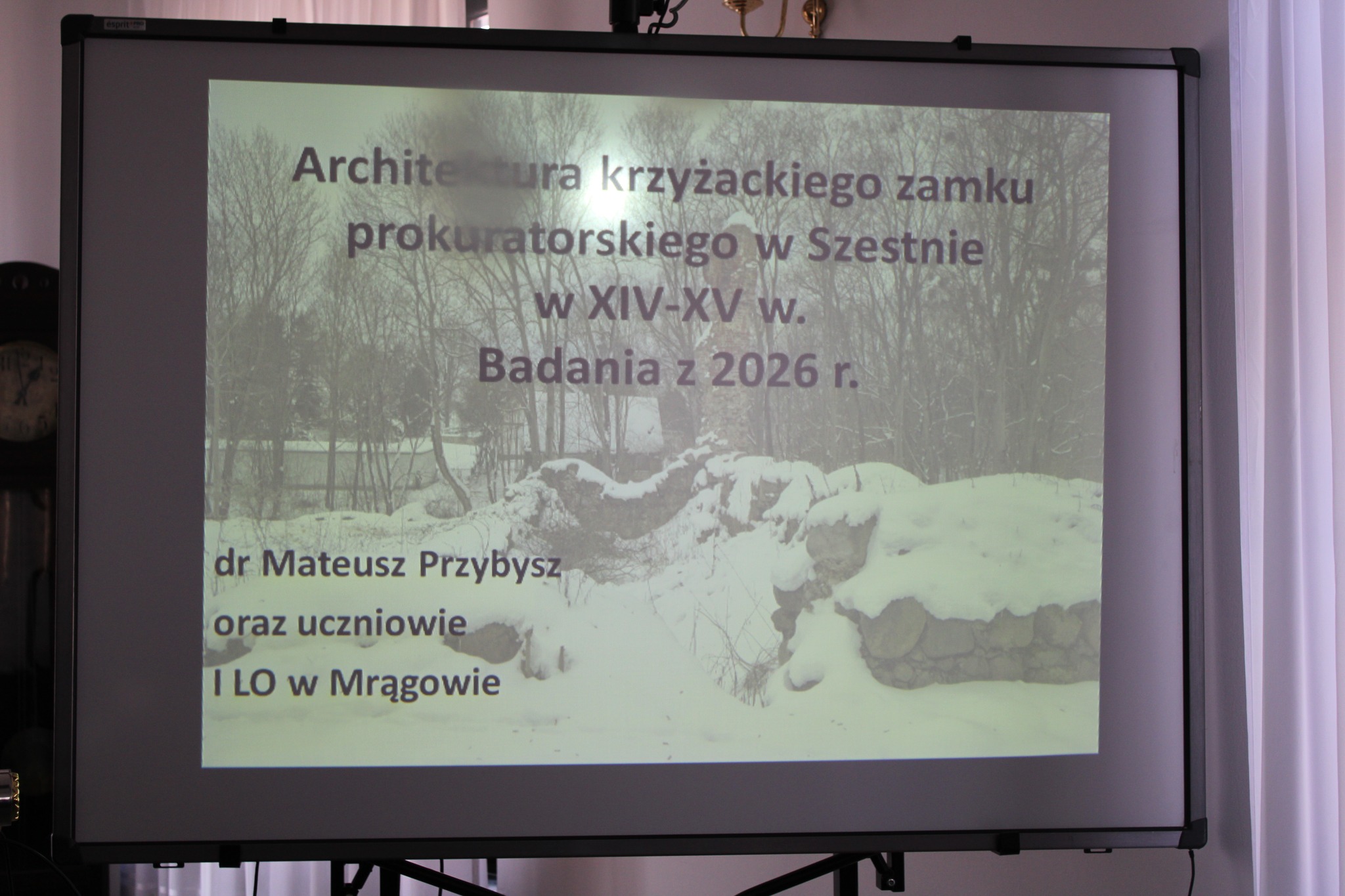 Drugą częścią spotkania, był wykład opiekuna projektu i jednocześnie absolwenta Naszego Liceum, p. dr Mateusza Przybysza, który zaprezentował zrekonstruowaną w ramach projektu historię i bryłę zamku krzyżackiego w Szestnie. Pod kierunkiem p. Przybysza uczestnikom udało się odtworzyć wygląd i układ pomieszczeń, będącego obecnie w stanie trwałej ruiny zamku.