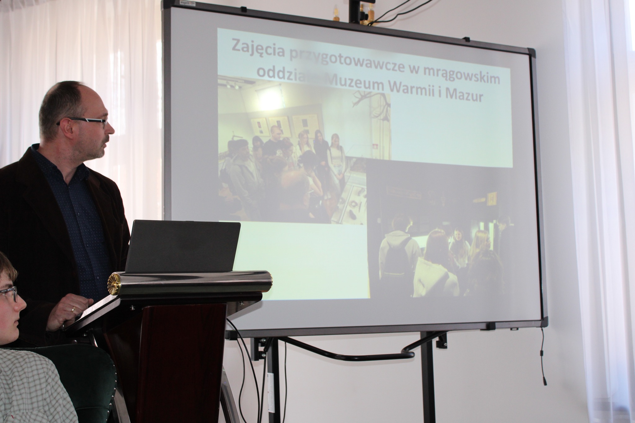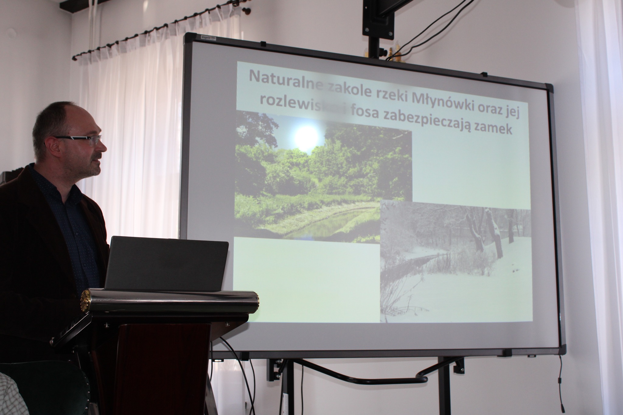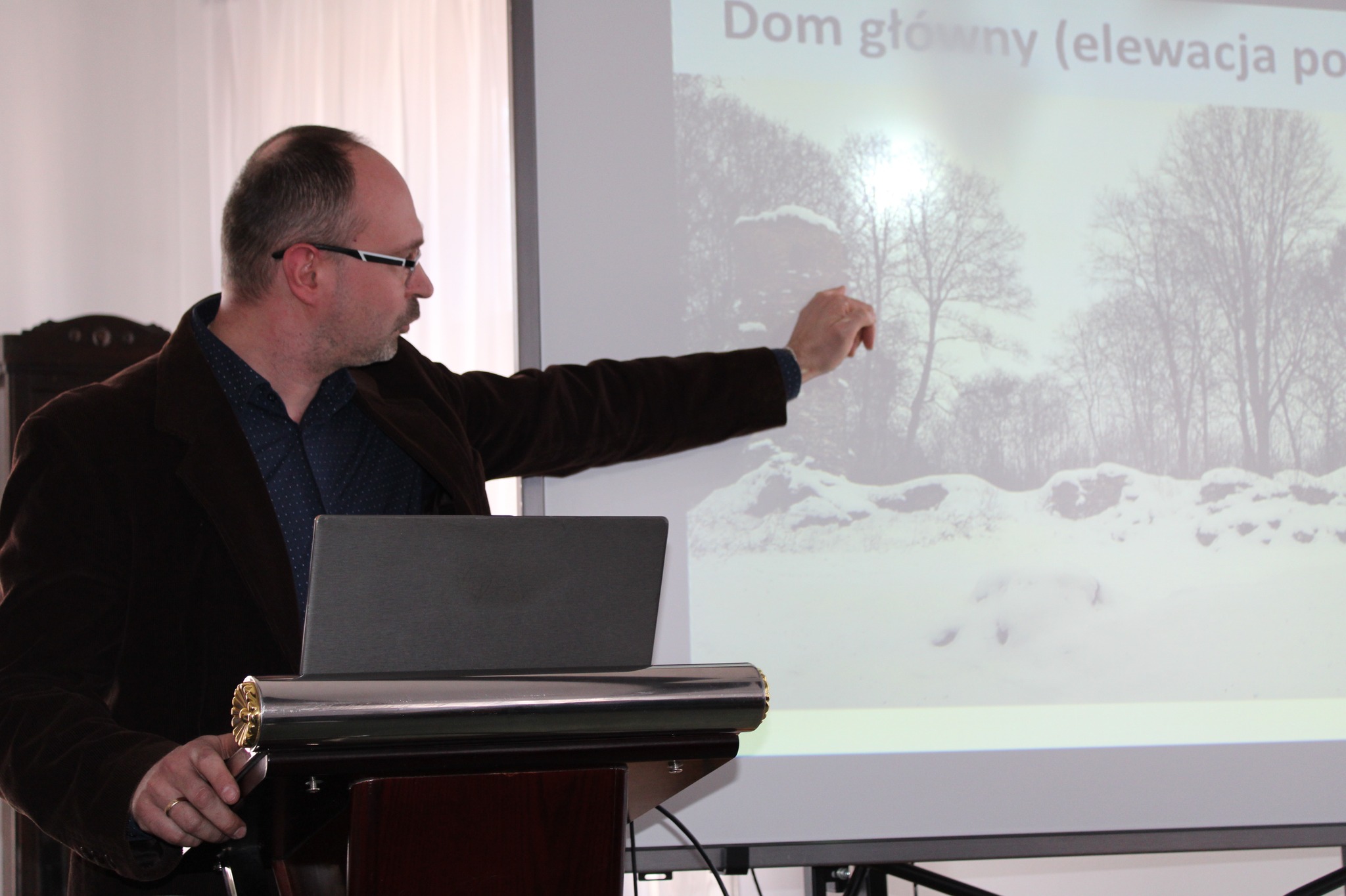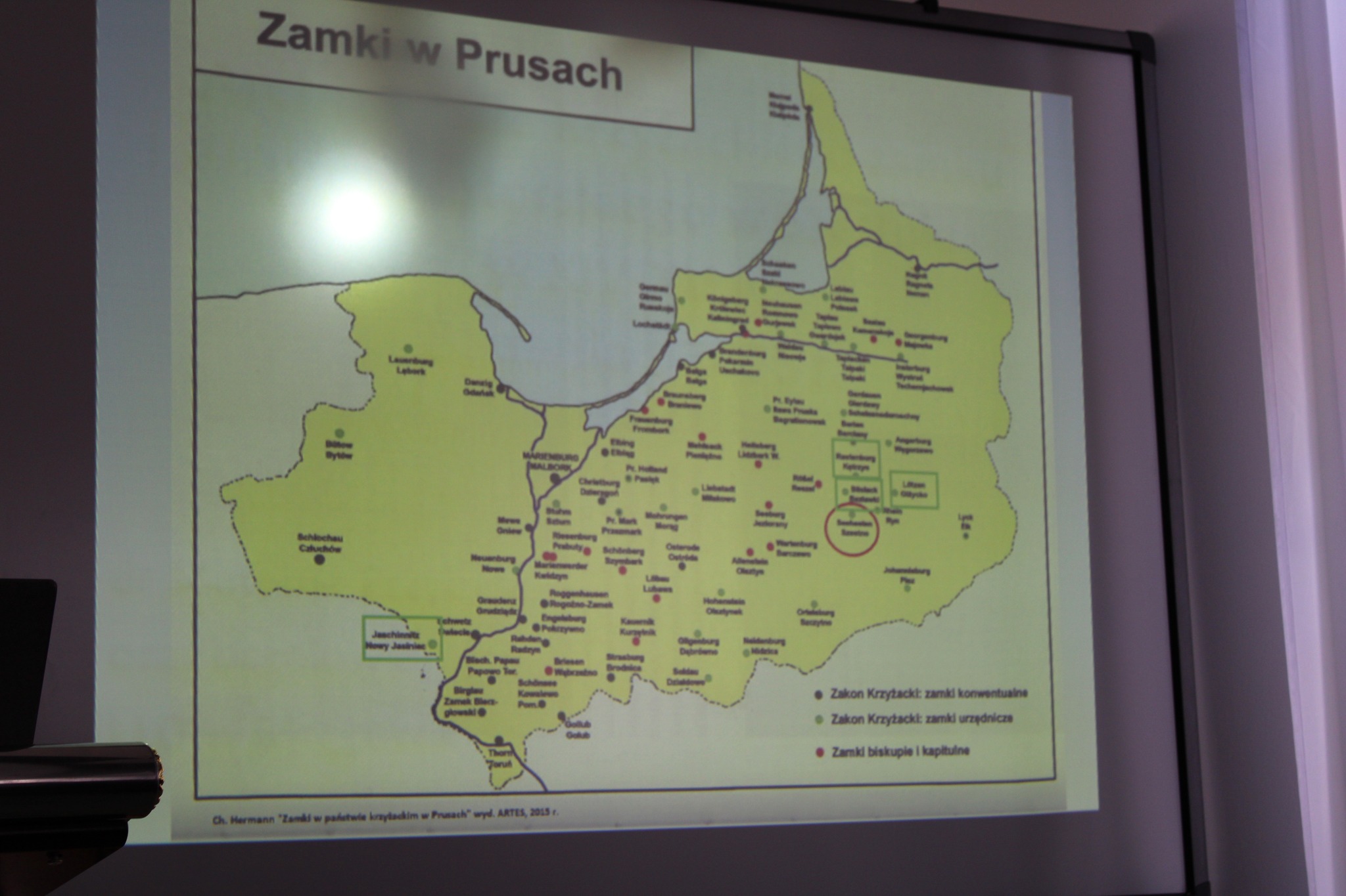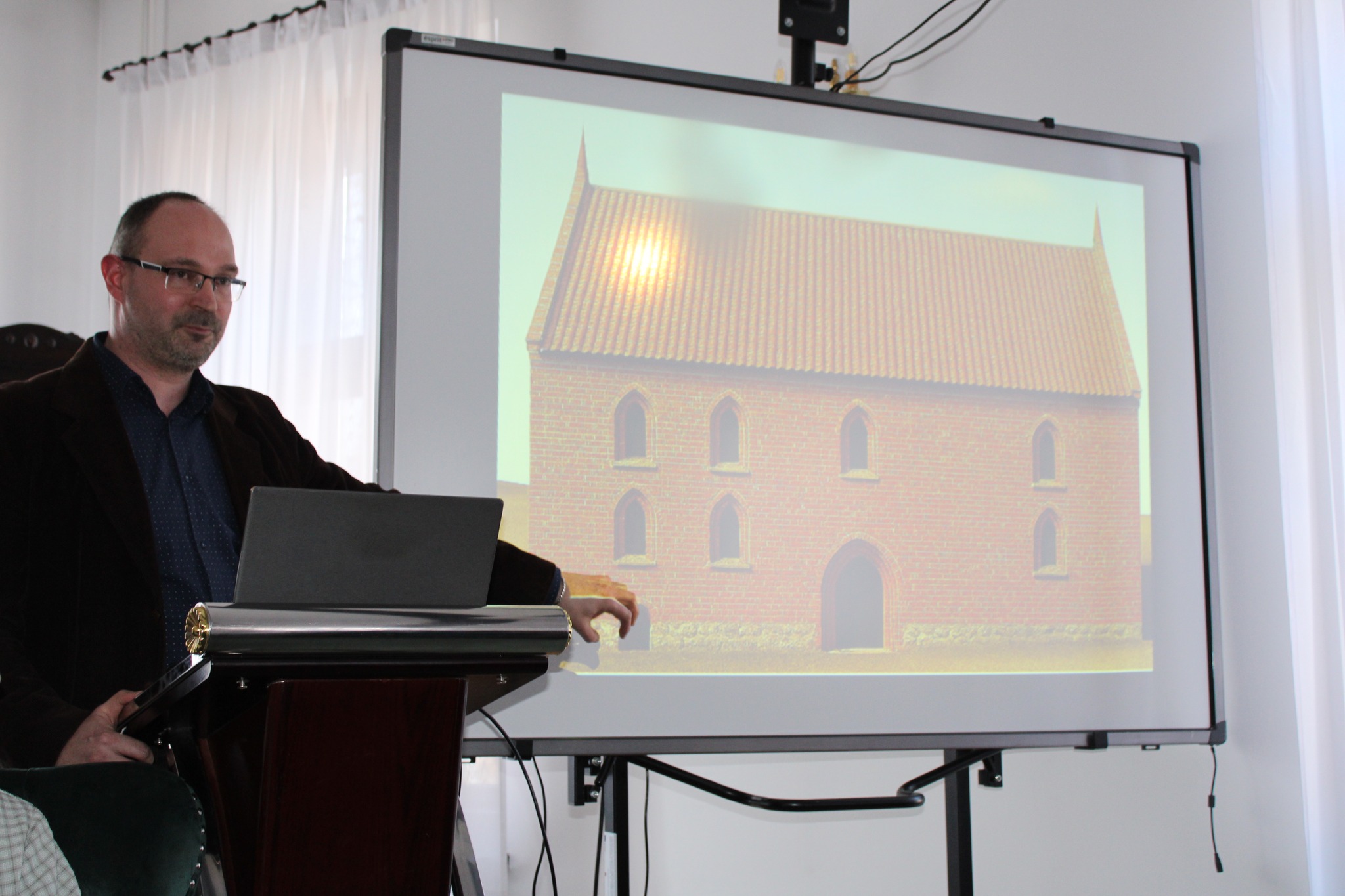 Drugą częścią spotkania, był wykład opiekuna projektu i jednocześnie absolwenta Naszego Liceum, p. dr Mateusza Przybysza, który zaprezentował zrekonstruowaną w ramach projektu historię i bryłę zamku krzyżackiego w Szestnie. Pod kierunkiem p. Przybysza uczestnikom udało się odtworzyć wygląd i układ pomieszczeń, będącego obecnie w stanie trwałej ruiny zamku.