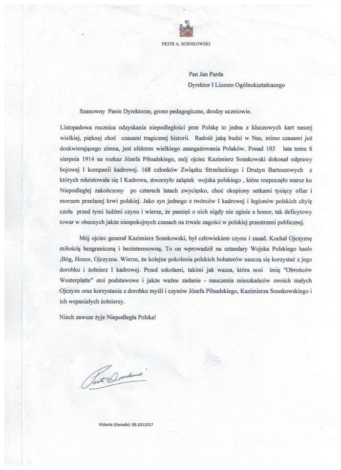 Uczniowie przedstawili program artystyczny obejmujący wiersze i pieśni niepodległościowe. W drugiej części spotkania Waldemar Ziarek przybliżył postać wybitnego działacza niepodległościowego, komendanta ZWZ i Naczelnego Wodza Polskich Sił Zbrojnych Kazimierza Sosnkowskiego. Waldemar Ziarek na ręce Dyrektora Szkoły przekazał okolicznościowy list od Pawła Sosnkowskiego, syna Kazimierza Sosnkowskiego, skierowany do społeczności szkoły.