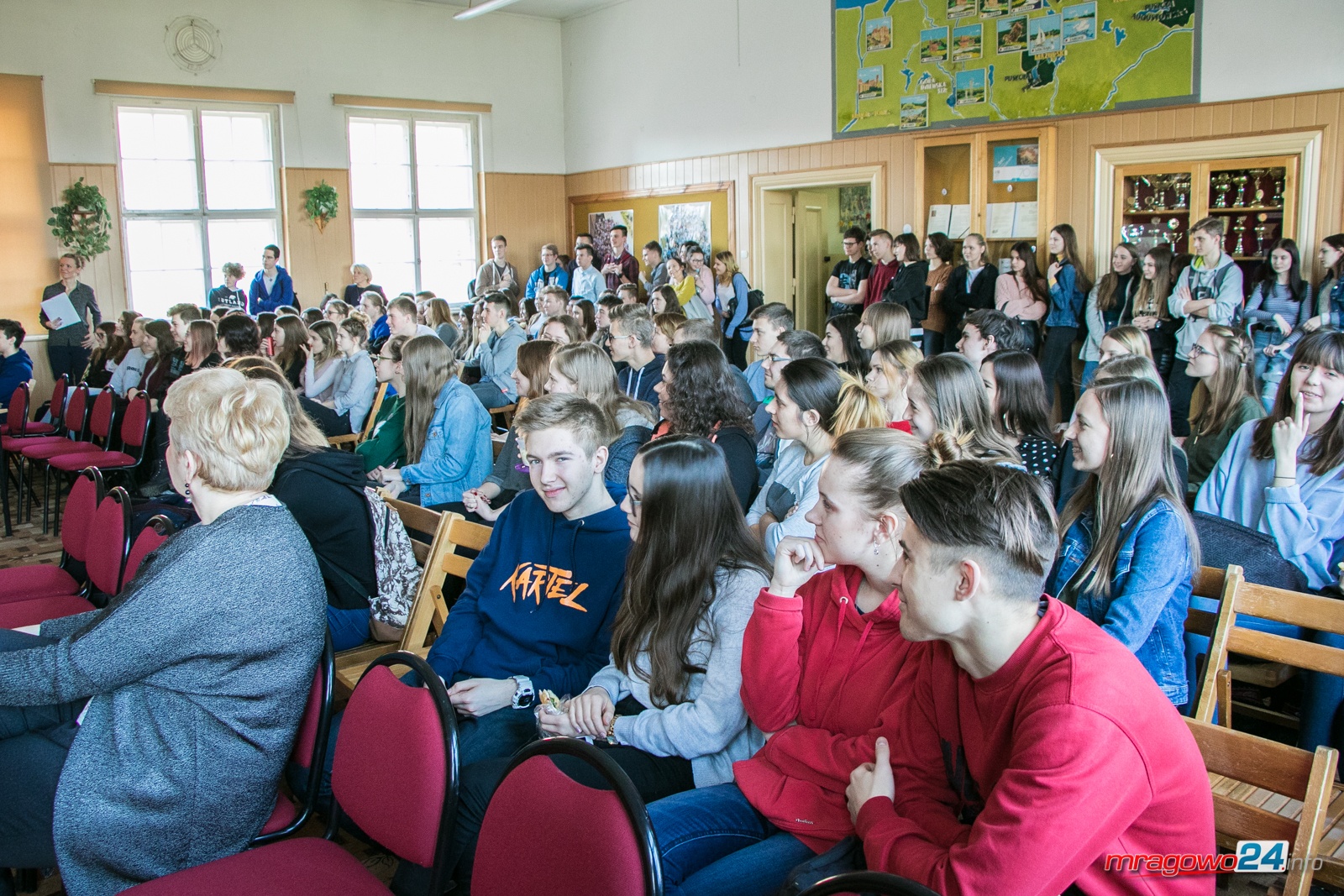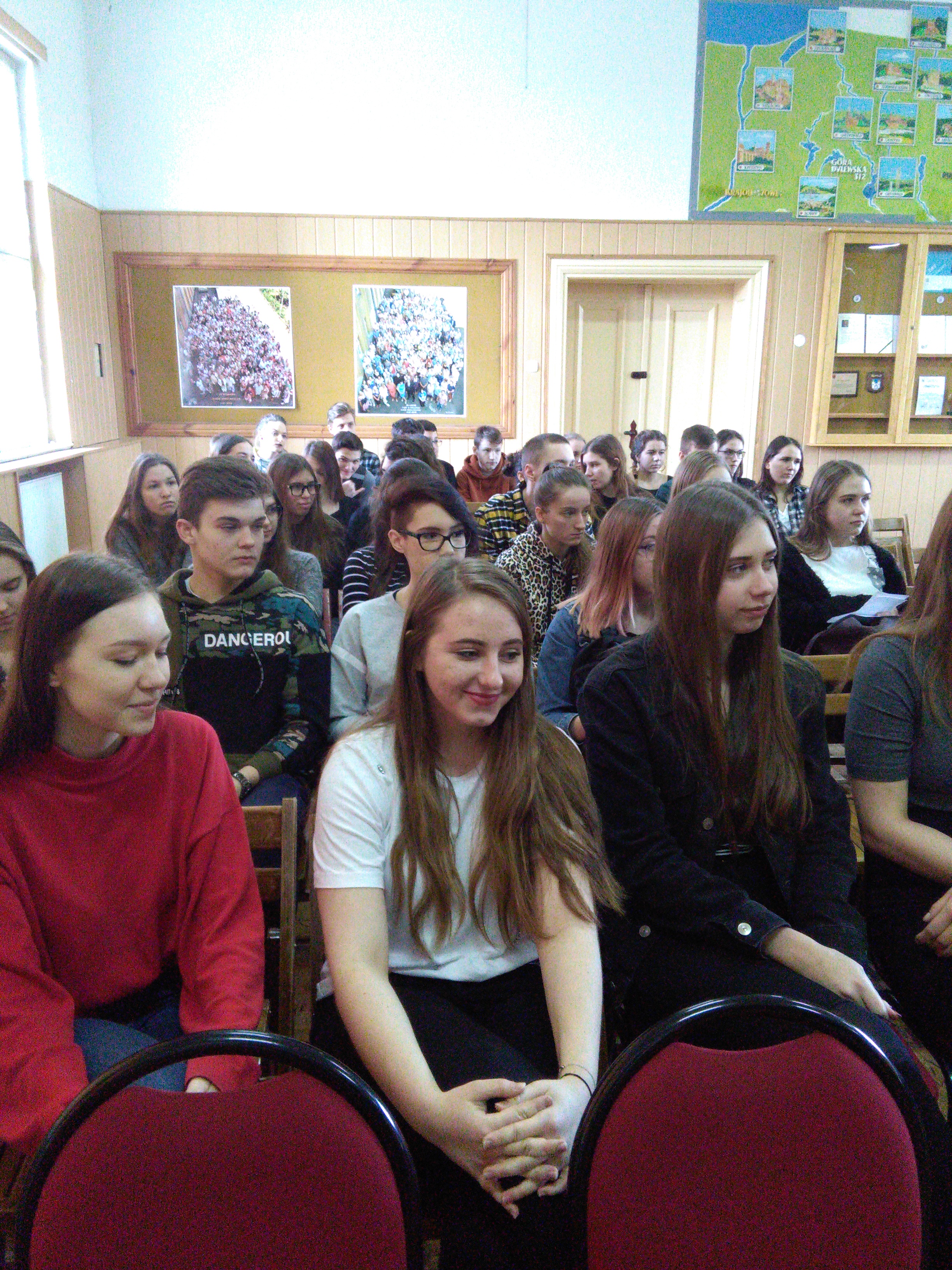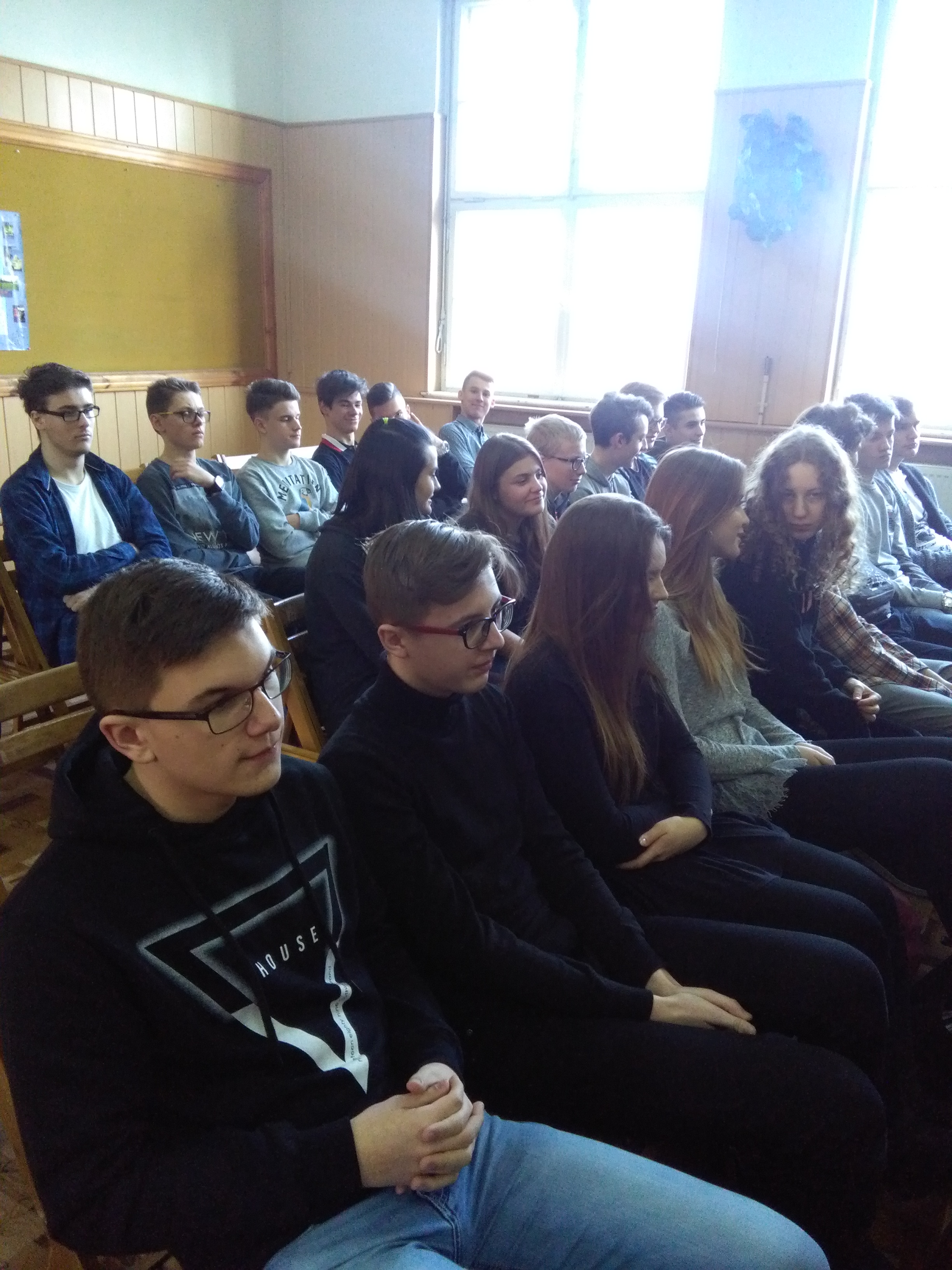 Zebrani uczniowie klas pierwszych wysłuchali również nagrania wystąpienia Michała Rusinka- sekretarza Wisławy Szymborskiej , który jest znawcą i propagatorem sztuki retorycznej.