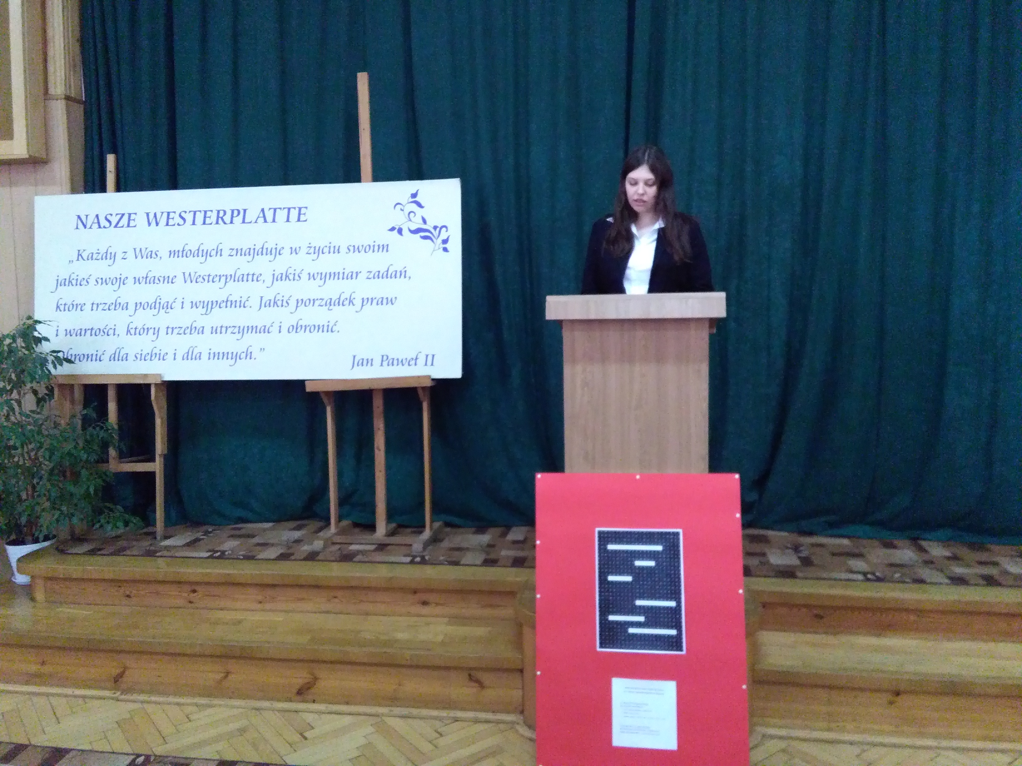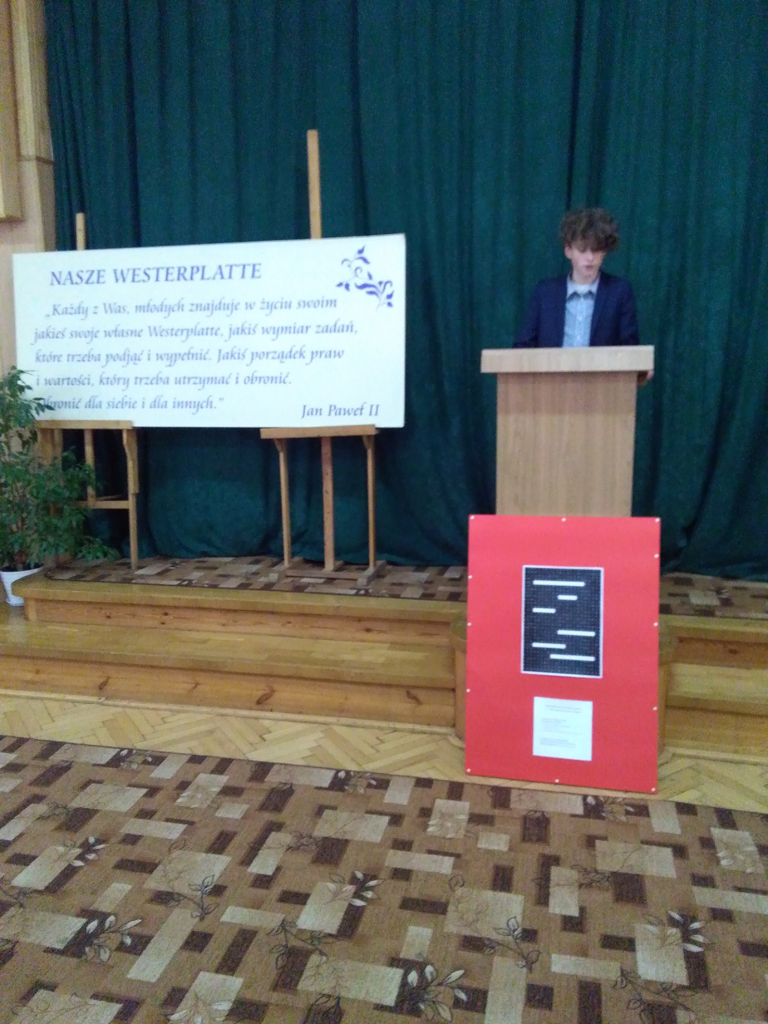 Wszyscy uczniowie klas pierwszych przystąpili do konkursu pod hasłem „ Nasze Westerplatte”. Konkurs, związany z patronem naszej szkoły, organizowany jest już od 9. lat. Zadaniem uczestników tegorocznej edycji było napisanie przemówienia inspirowanego słowami Jana Pawła II : „ Każdy z Was młodych ma jakieś swoje własne Westerplatte…”