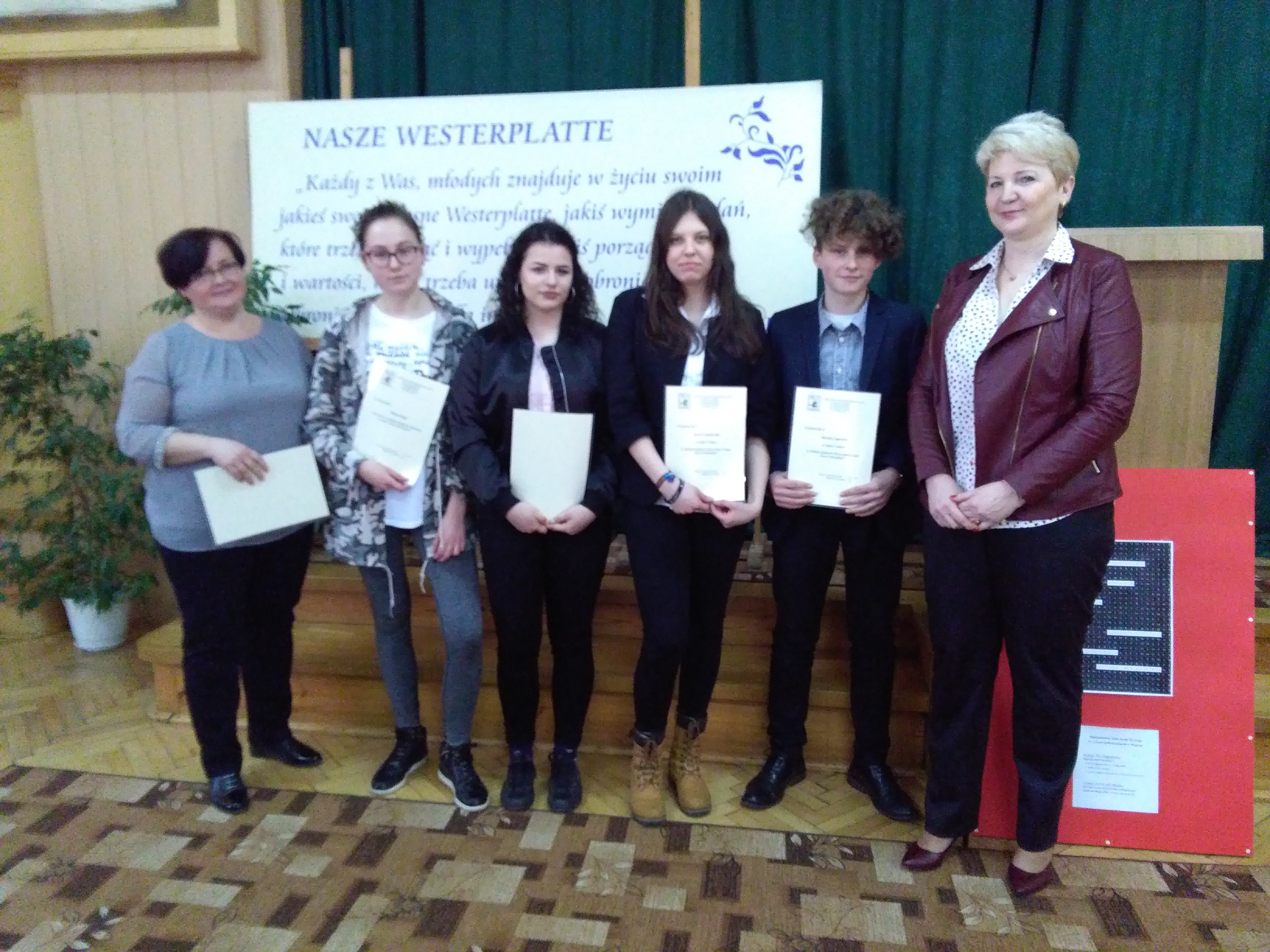I miejsce zajął Piotr Zapert z kl.1a, II miejsce przypadło uczennicy kl. 1c Joannie Sypniewskiej, III miejsce zdobyła Karolina Laska z kl.1a. Jury przyznało również dwa wyróżnienia: Kornelii Kodź z kl. 1b i Wiktorii Sękiel z kl.1c. Laureaci otrzymali pamiątkowe dyplomy, nagrody rzeczowe zostaną im wręczone podczas uroczystości zakończenia roku szkolnego.