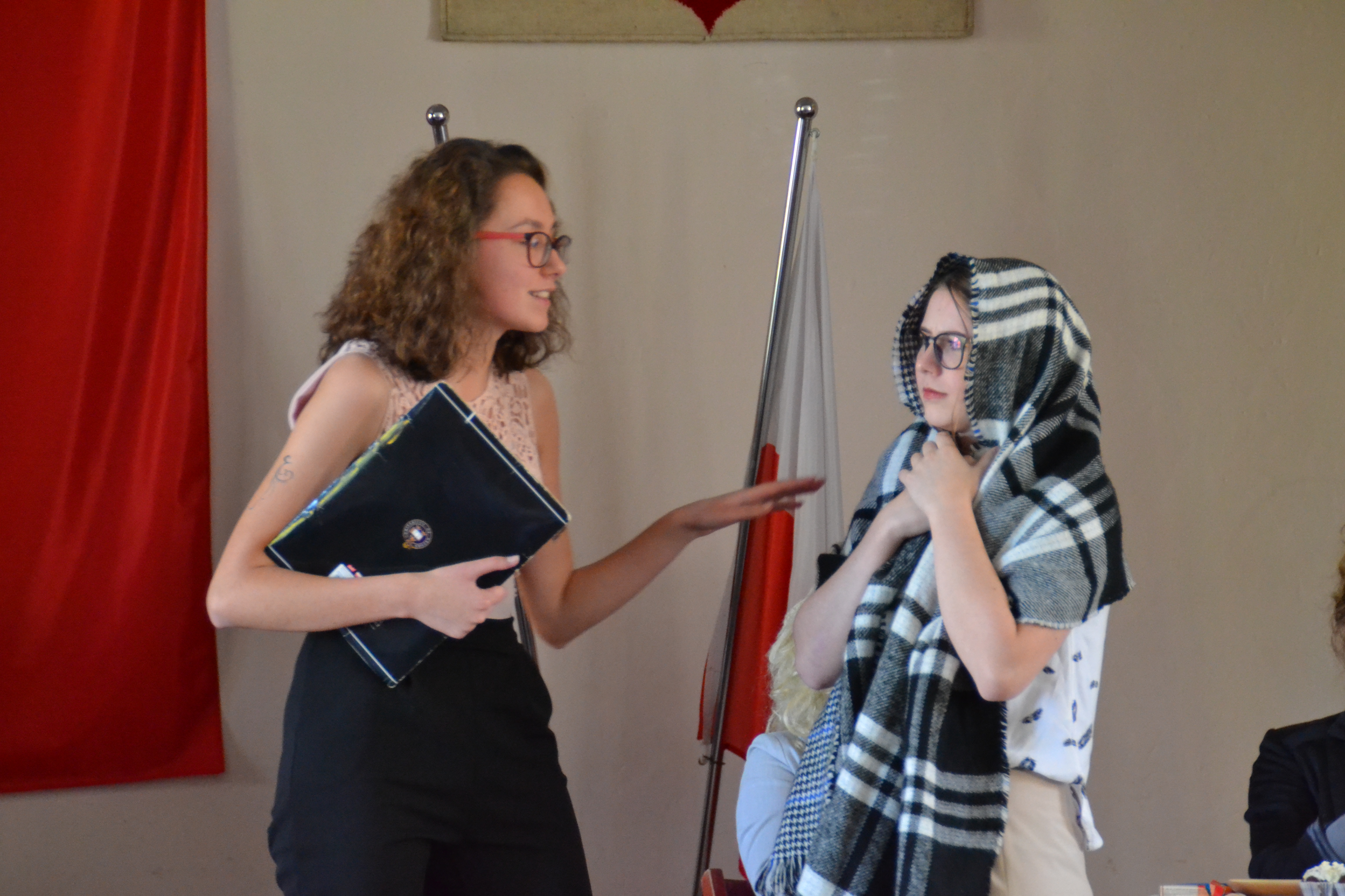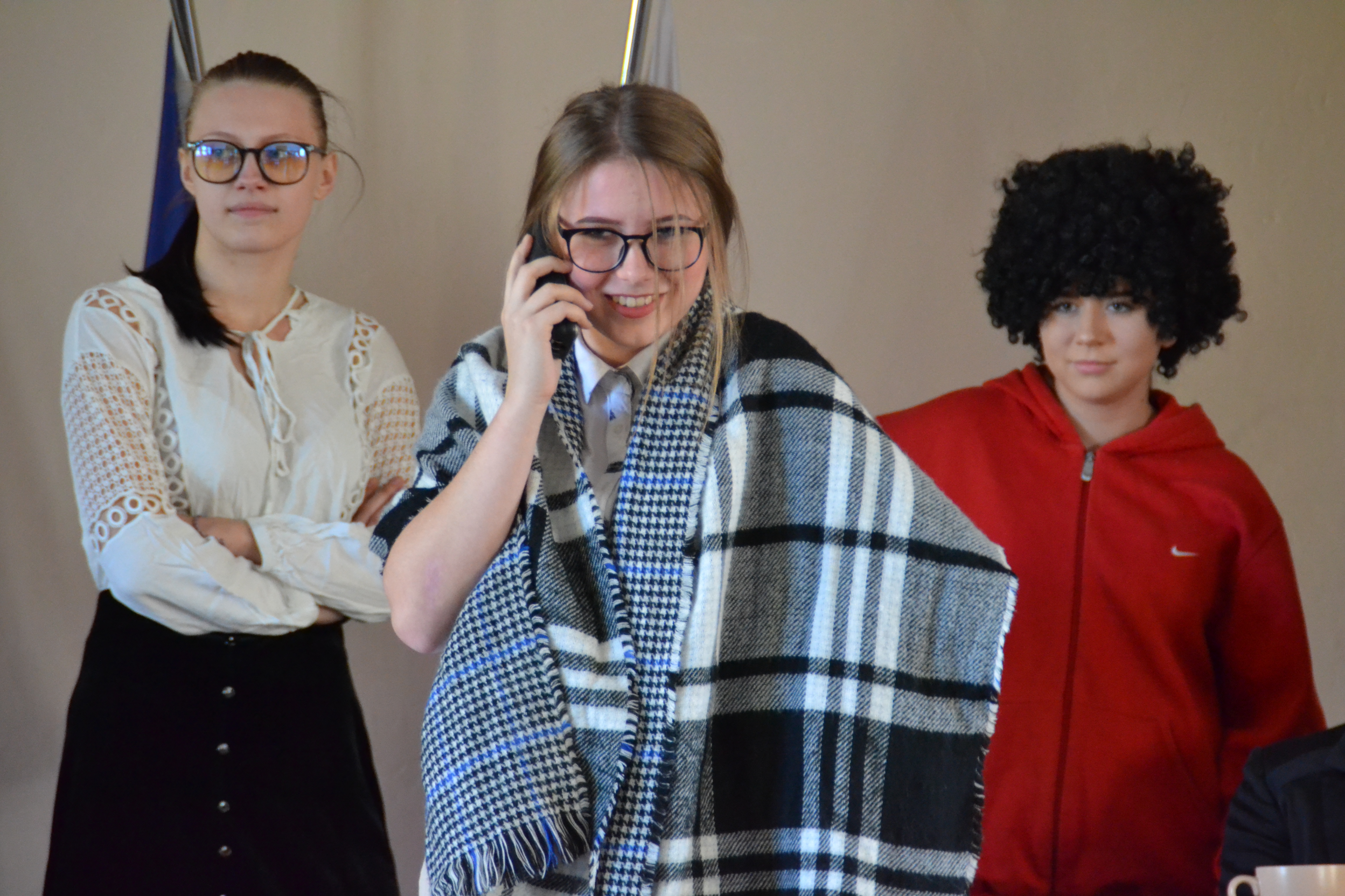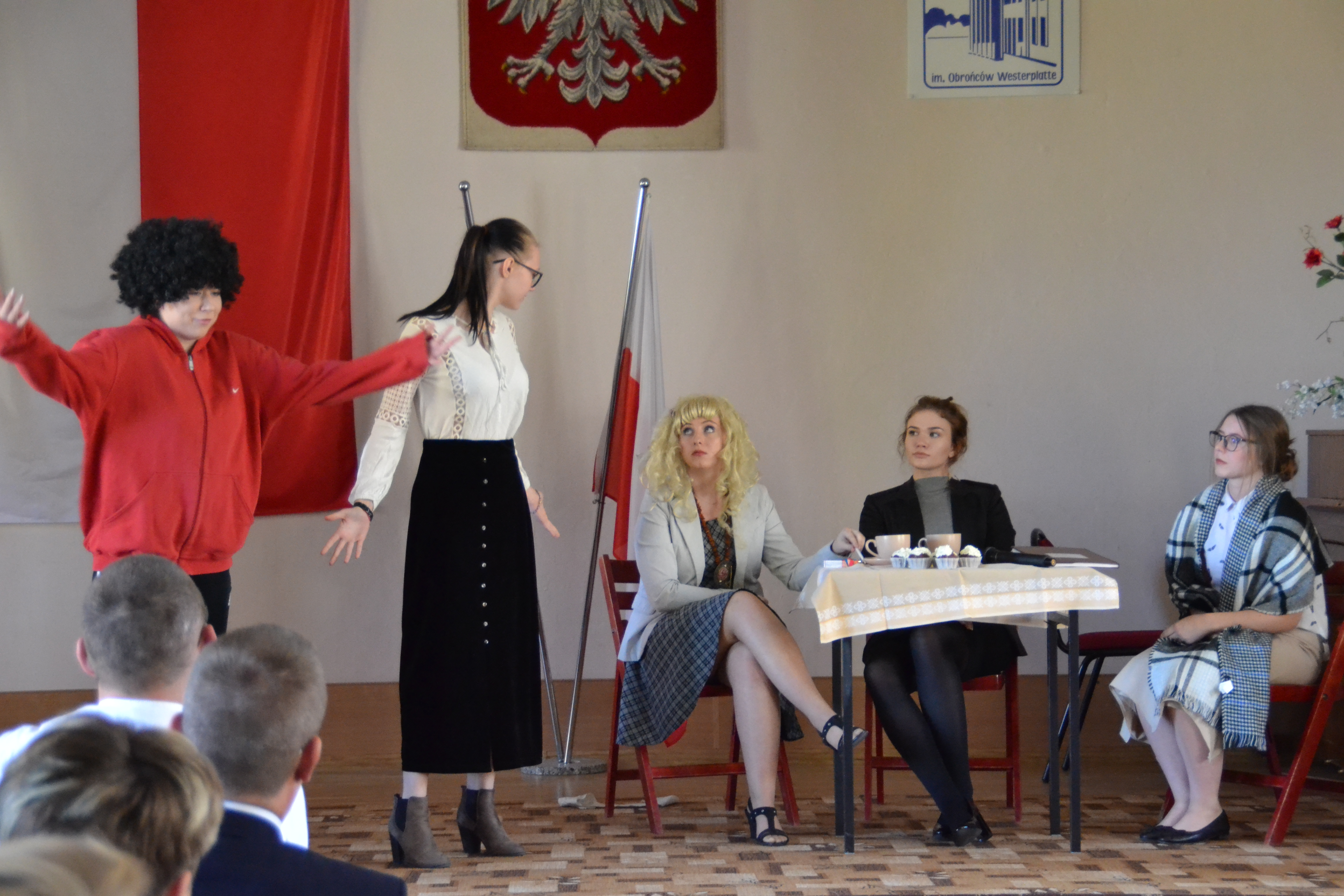 W czasie szkolnej uroczystości nie zabrakło akcentu artystycznego. Młodzież naszej szkoły pod opieką p. Piotra Markowicza przygotowała i zaprezentowała skecz przybliżający klimat pokoju nauczycielskiego zdominowanego przez bardzo „charakterne” nauczycielki…