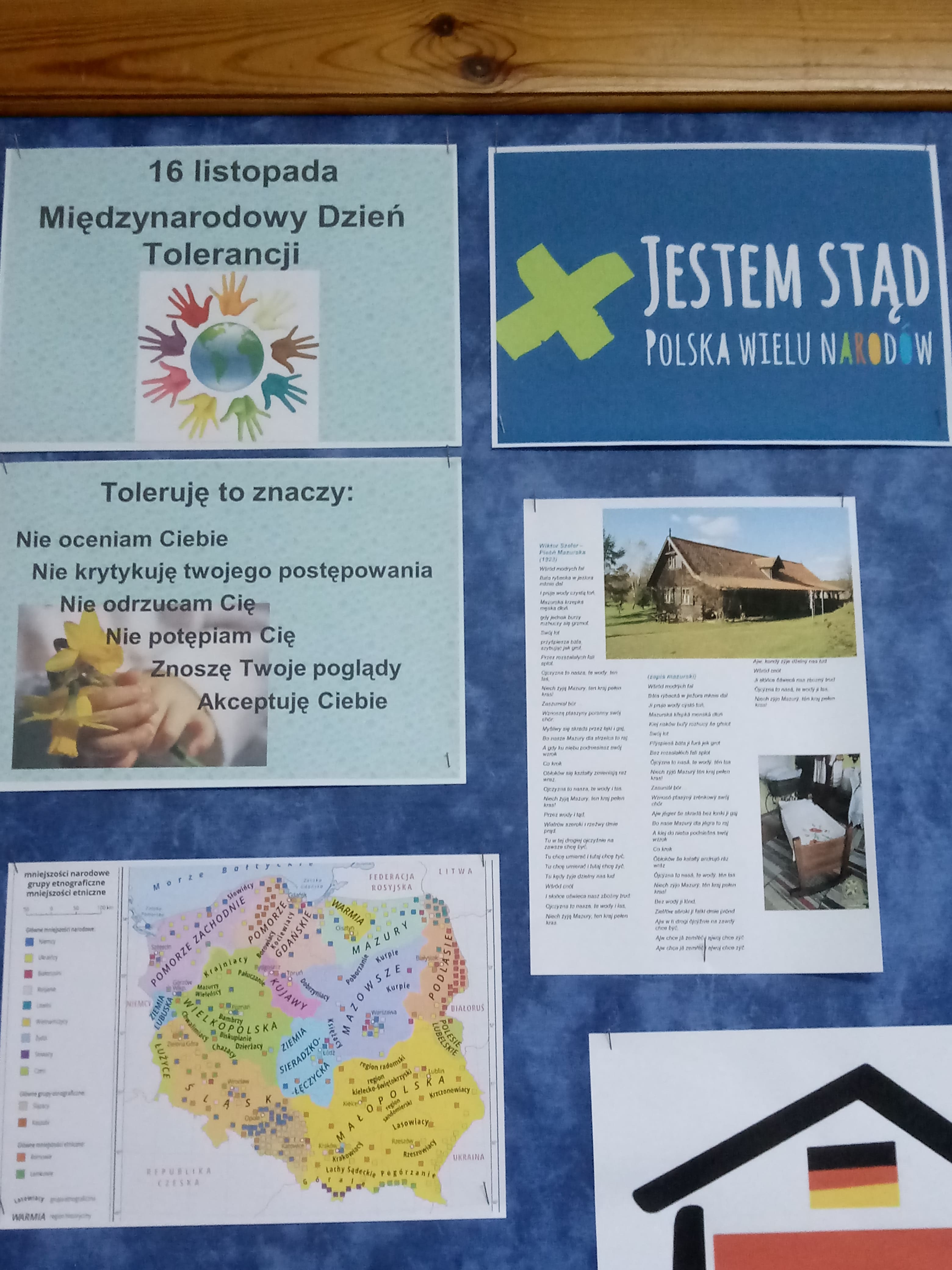 Tradycyjnie, jak co roku w naszej szkole 16 listopada obchodziliśmy Międzynarodowy Dzień Tolerancji. Tematem konkursu była „ Niepodległa Wielu Narodów”. W związku z 100. rocznicą odzyskania przez nasz kraj niepodległości chciałam, aby młodzież przybliżyła nam wspaniałe bogactwo mniejszości narodowych, etnicznych i kulturowych Polaków. W konkursie wzięły udział wszystkie klasy. Każda z klas przygotowała poster zgodnie z wylosowanym tematem.