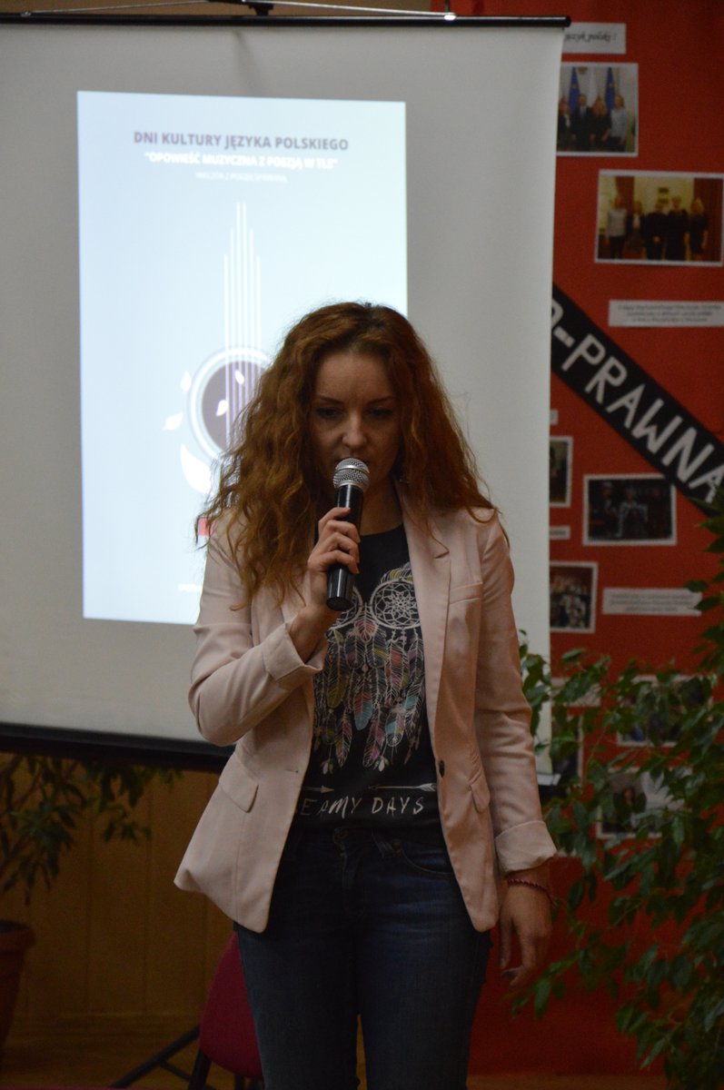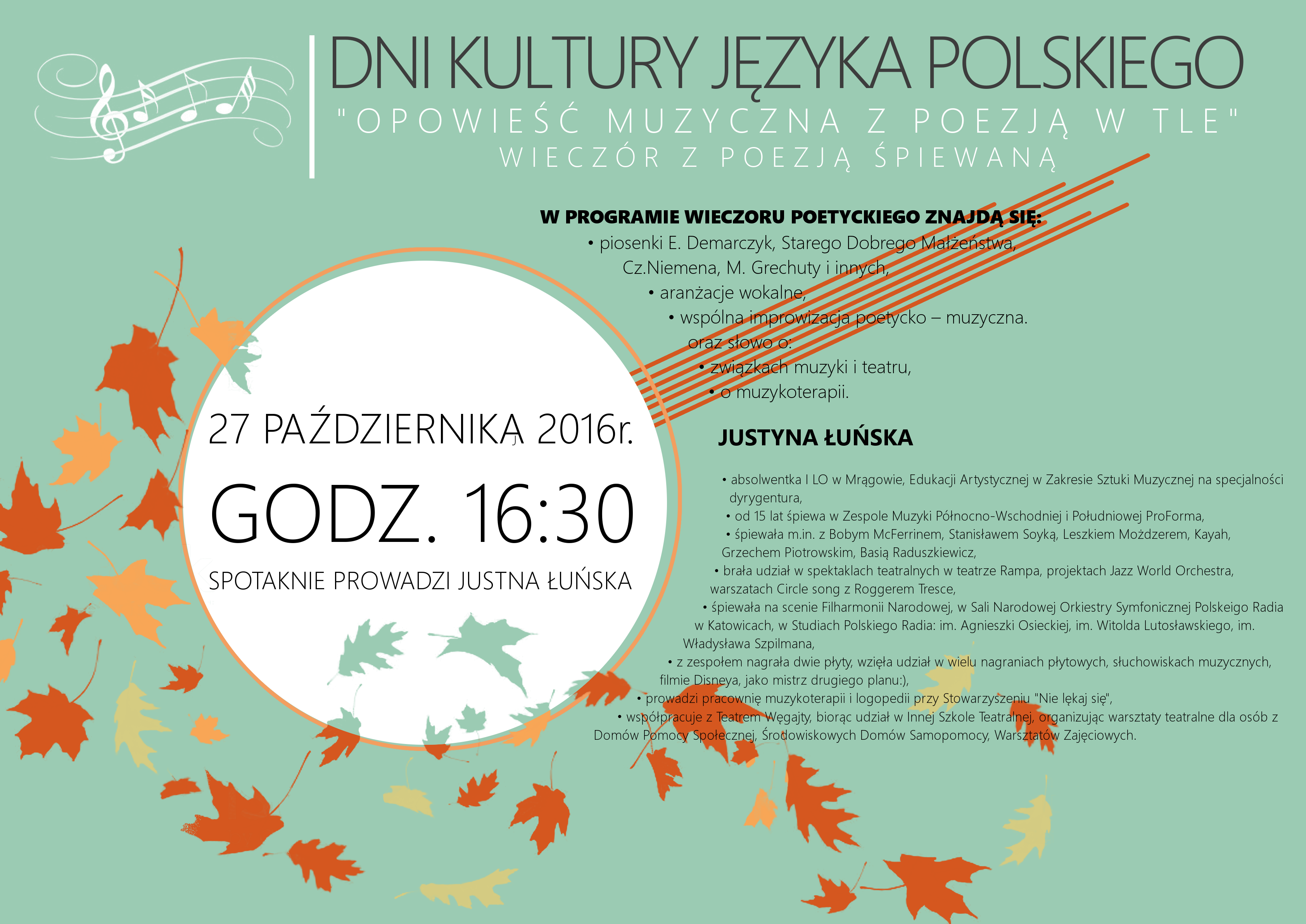 Punktem kulminacyjnym tegorocznych obchodów Dni Kultury Języka Polskiego był czwartkowy wieczór poezji śpiewanej pt. ”Opowieść muzyczna z poezją w tle” poprowadzony przez niezwykle utalentowaną i charyzmatyczną Justynę Łuńską- niegdyś uczennicę I Liceum Ogólnokształcącego w Mrągowie.