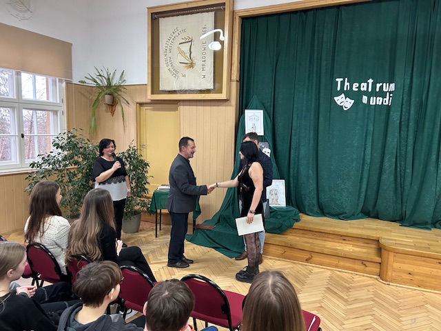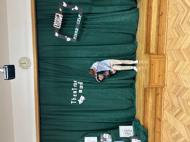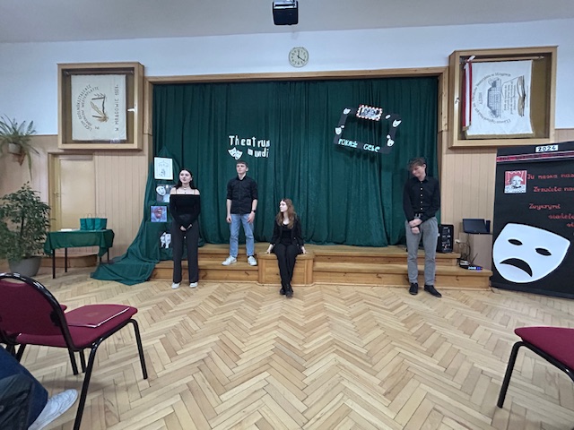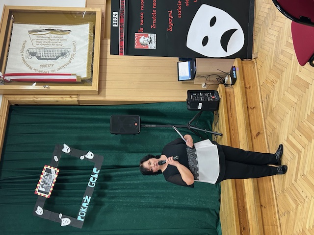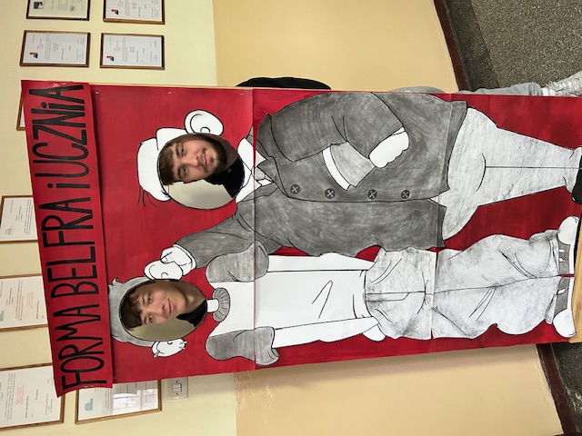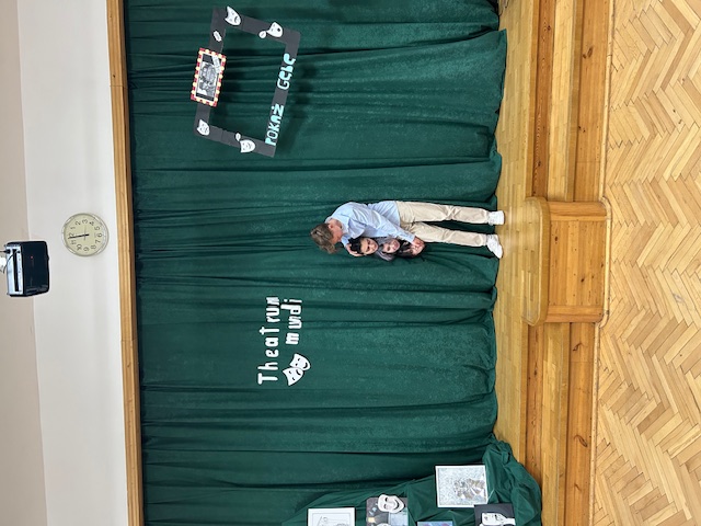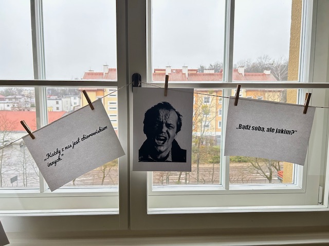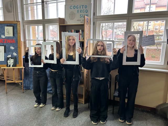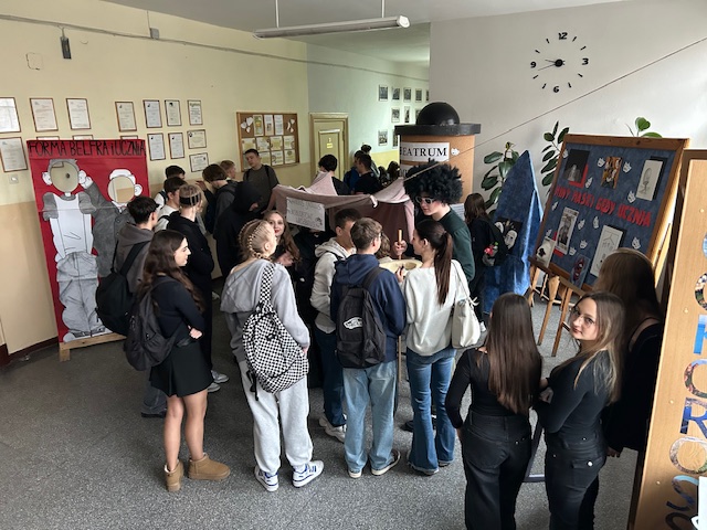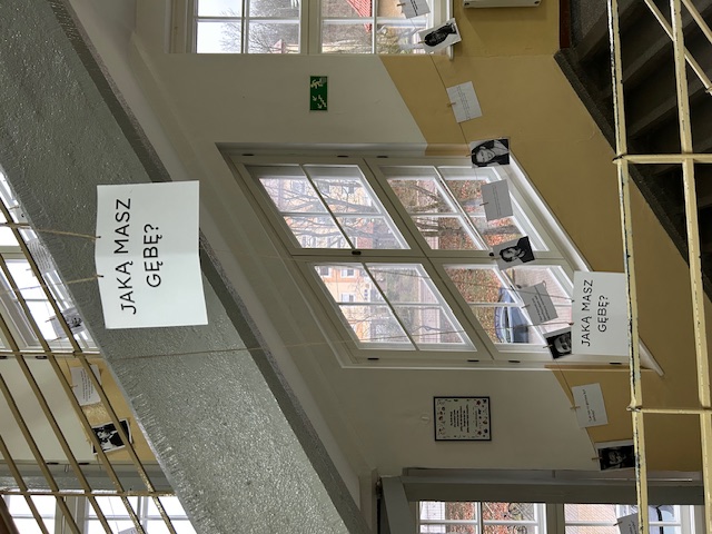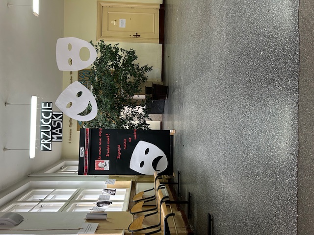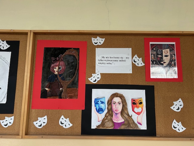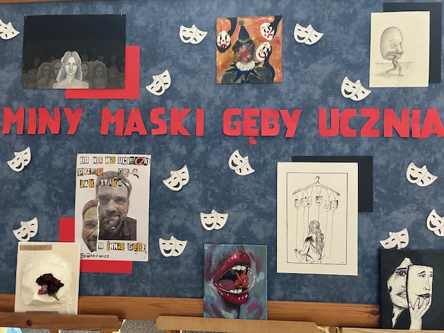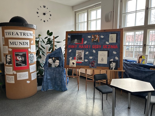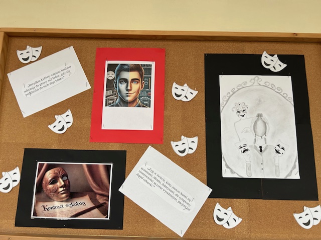 Korytarze szkolne ozdobione były obrazkami aktorów robiących różne miny i cytatami Witolda Gombrowicza związanymi z tematyką theatrum mundi, aktorstwa i maski. Mogliśmy podziwiać prace plastyczne uczniów naszej szkoły porozwieszane na tablicach.