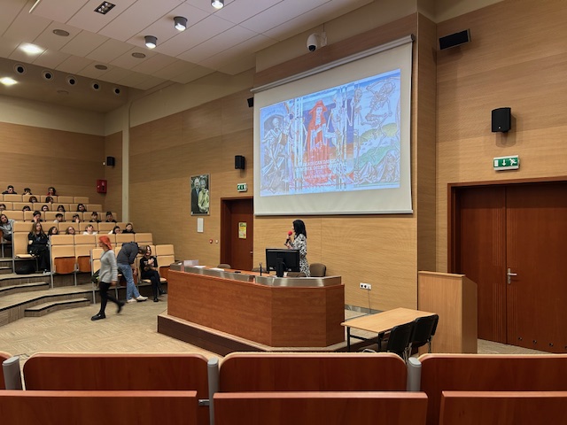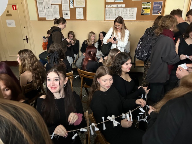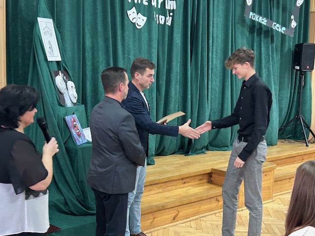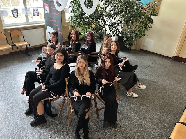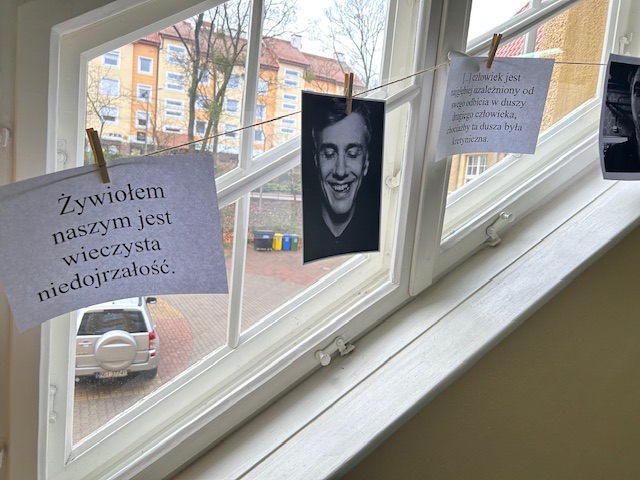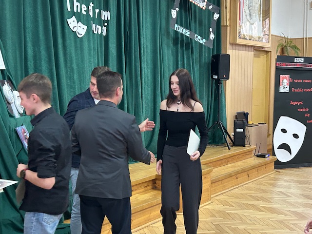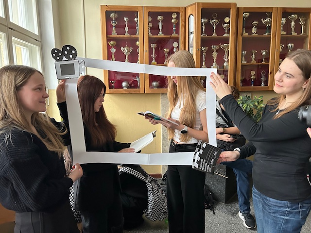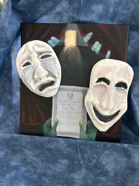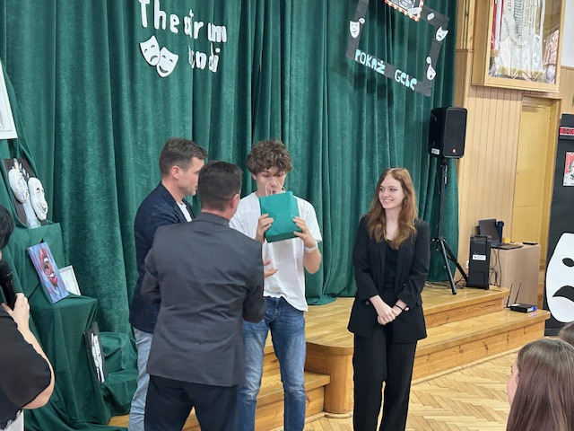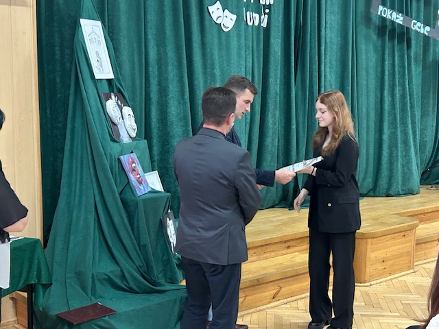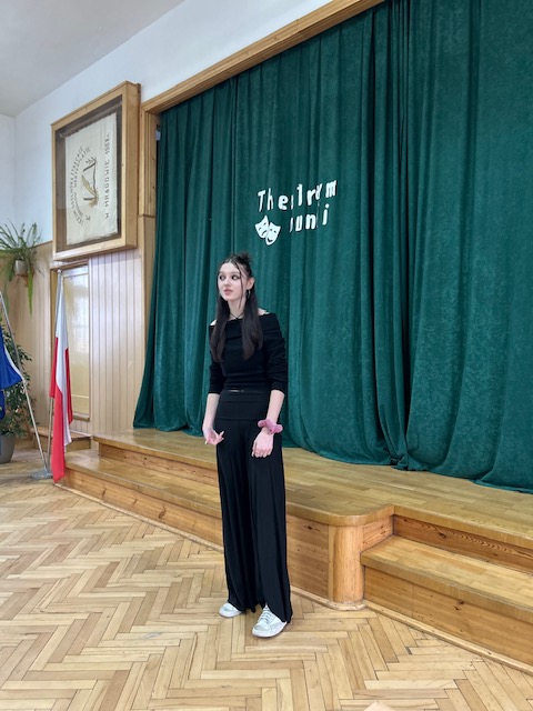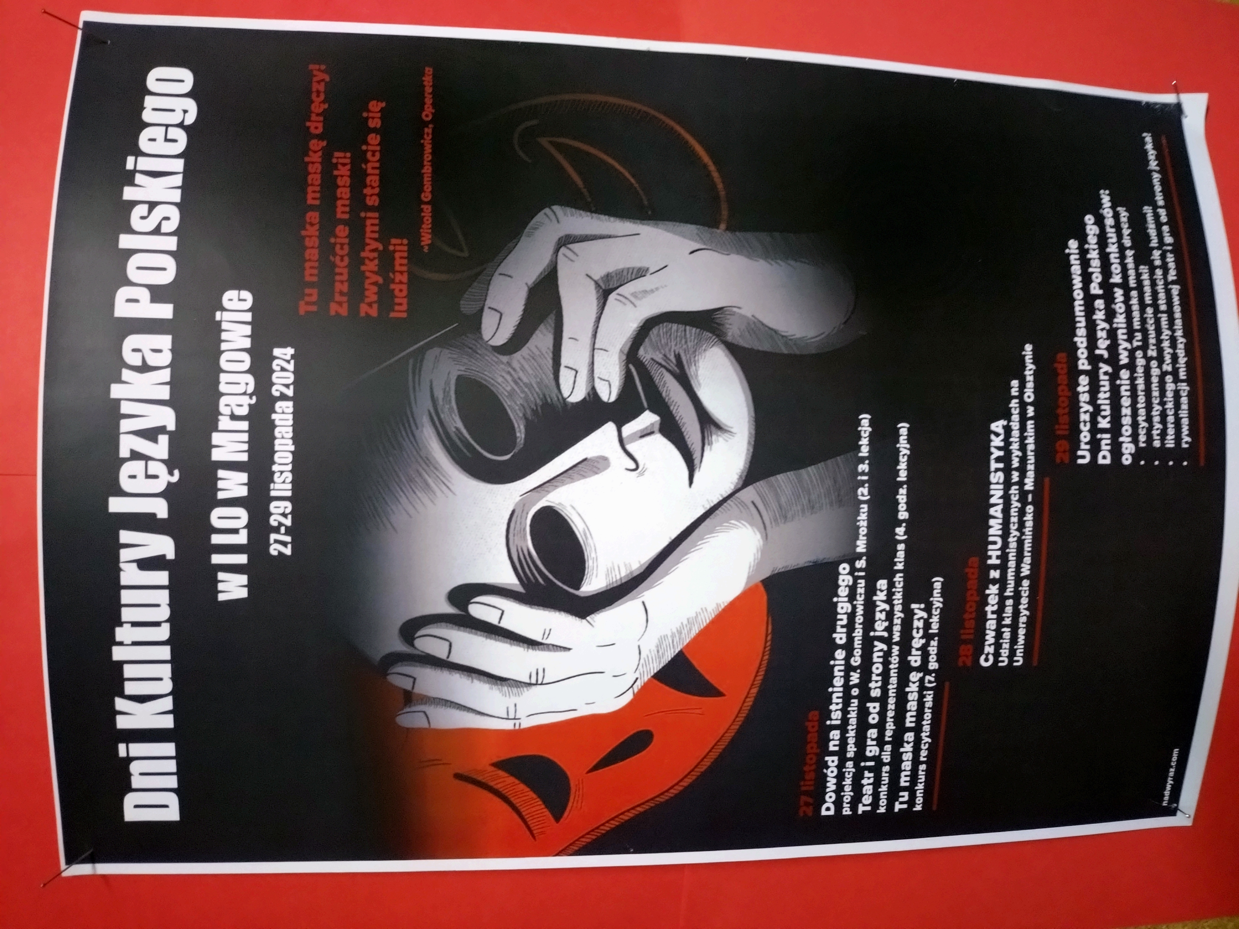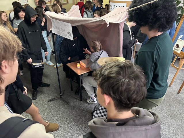 Korytarze szkolne ozdobione były obrazkami aktorów robiących różne miny i cytatami Witolda Gombrowicza związanymi z tematyką theatrum mundi, aktorstwa i maski. Mogliśmy podziwiać prace plastyczne uczniów naszej szkoły porozwieszane na tablicach.