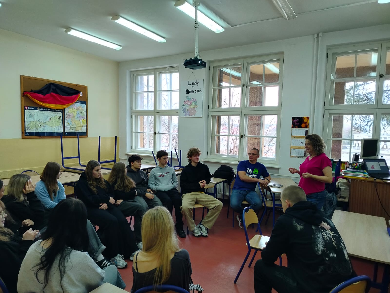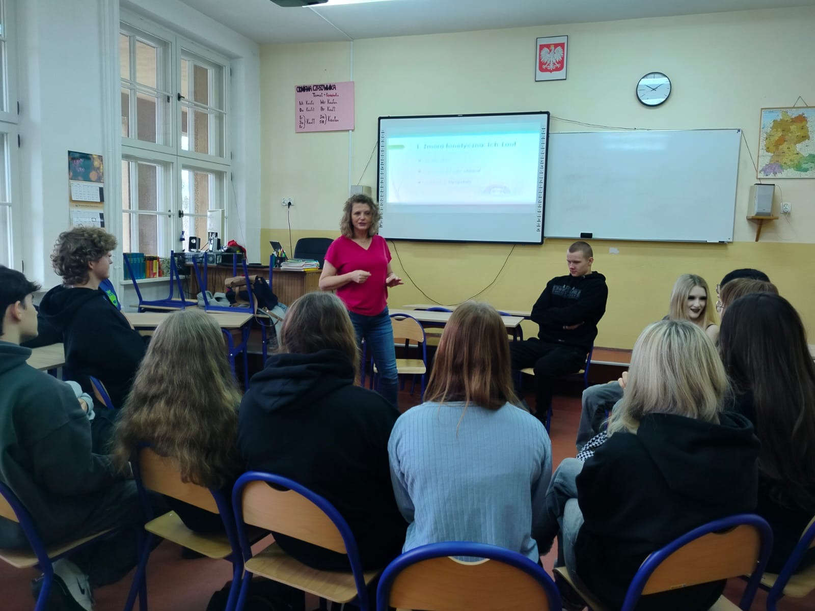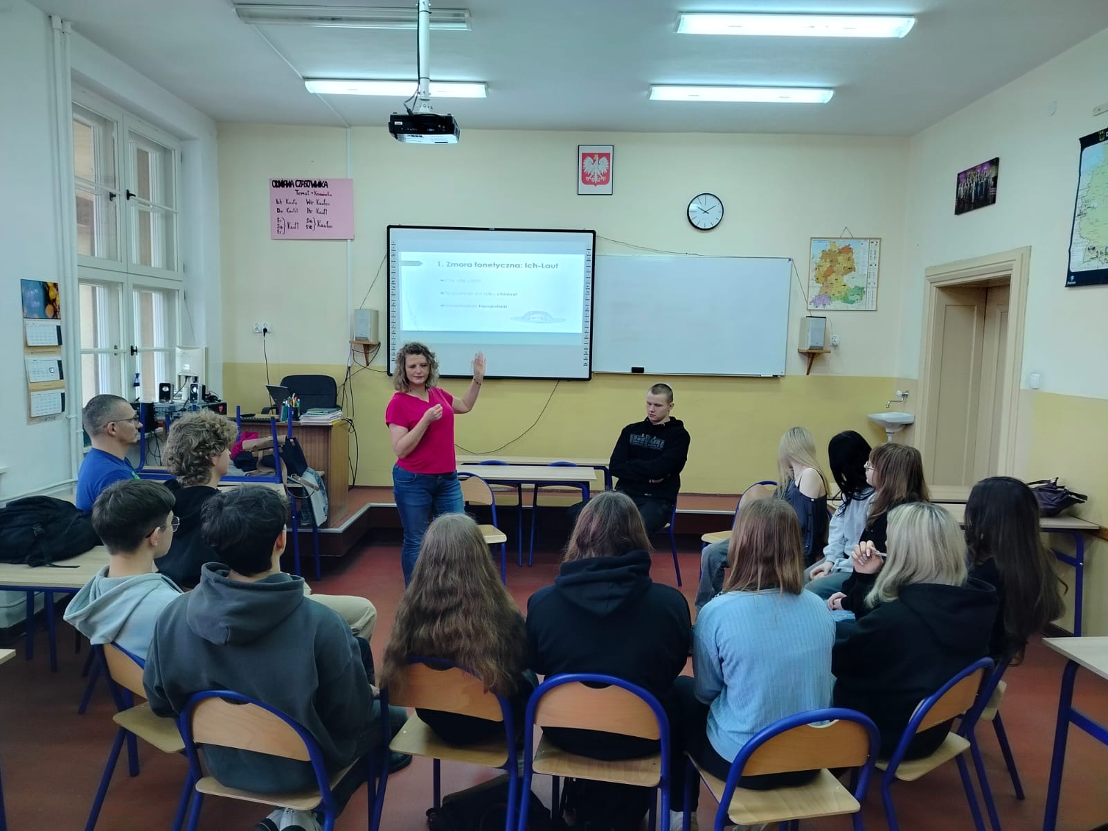 Wizyta pani doktor była doskonałą okazją dla licealistów, aby poznać praktyczne aspekty studiowania germanistyki oraz pogłębić swoją wiedzę językową pod okiem doświadczonego akademika. Zajęcia były bardzo udane ze względu na zastosowane metody nauczania: elementy teorii fonetycznej zostały efektownie i efektywnie połączone z praktycznymi ćwiczeniami w formie zabaw i quizów.