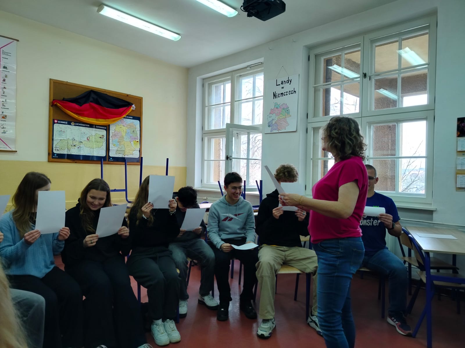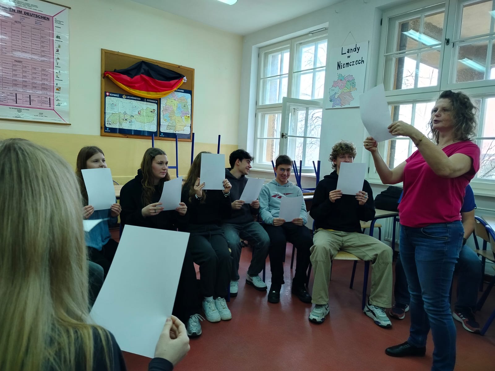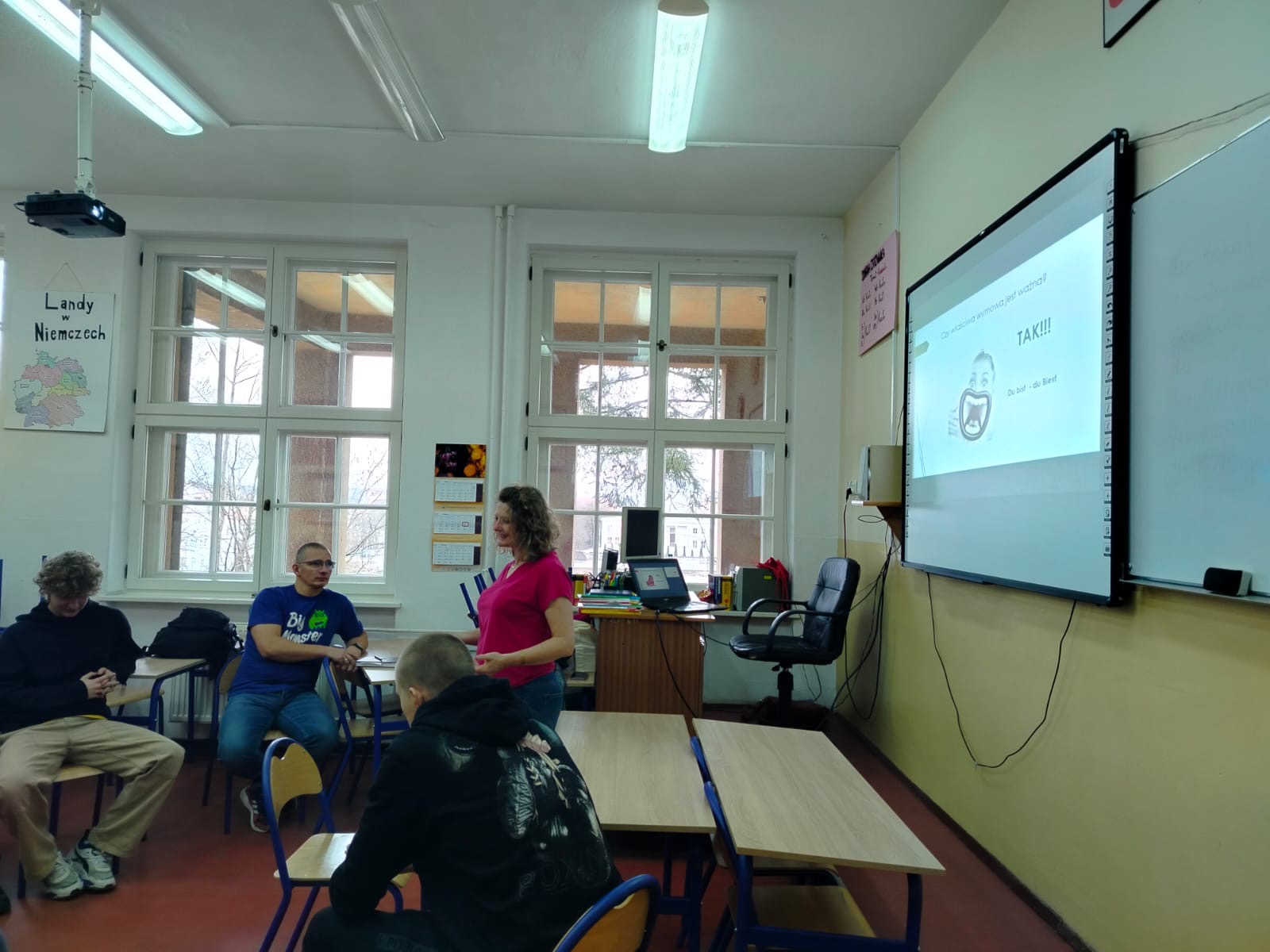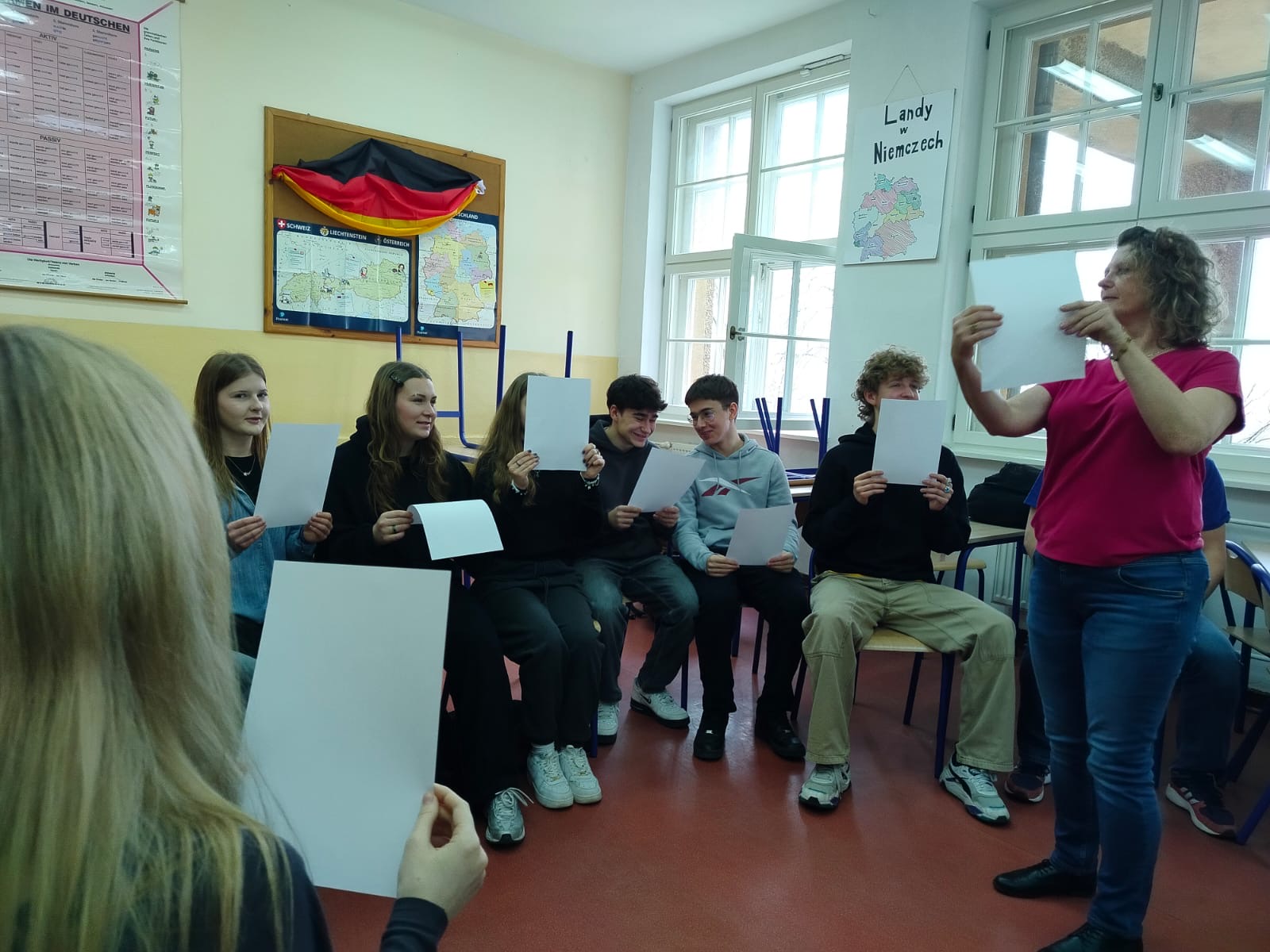 Wizyta pani doktor była doskonałą okazją dla licealistów, aby poznać praktyczne aspekty studiowania germanistyki oraz pogłębić swoją wiedzę językową pod okiem doświadczonego akademika. Zajęcia były bardzo udane ze względu na zastosowane metody nauczania: elementy teorii fonetycznej zostały efektownie i efektywnie połączone z praktycznymi ćwiczeniami w formie zabaw i quizów.