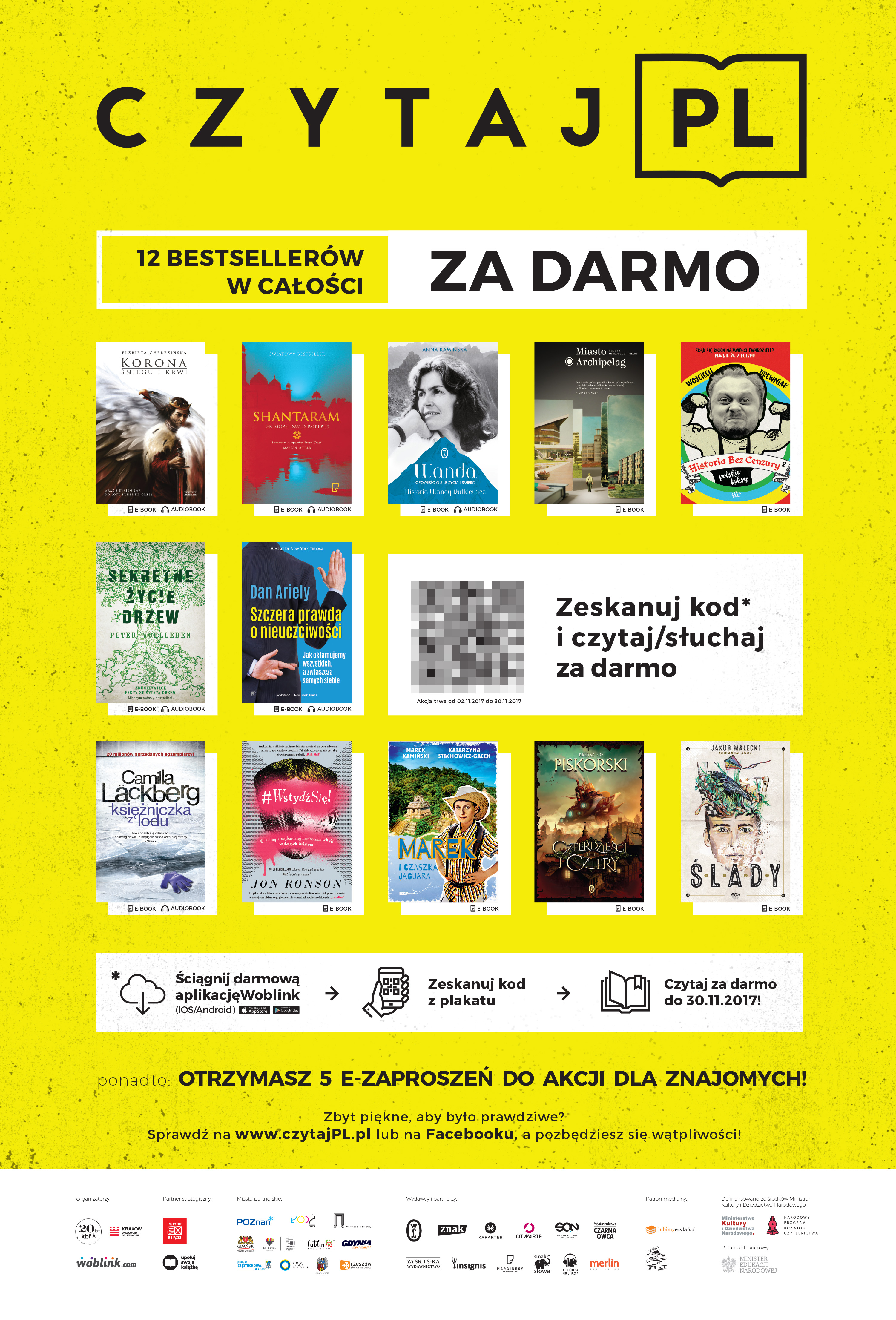 2 listopada wystartuje pierwsza edycja projektu „Upoluj swoją książkę” organizowanego w ramach akcji Czytaj PL. Uczniowie szkół ponadpodstawowych na terenie całego kraju będą mogli zupełnie za darmo przeczytać 12 bestsellerowych e-booków i audiobooków. Do szkół trafią plakaty z okładkami 12 książek i kodem QR. Książkę będzie można wypożyczyć na 5 minutowej przerwie wprost z korytarza. Wystarczy smartfon i aplikacja. Spośród 5000 zgłoszeń organizatorzy wyłonili 1000 Ambasadorów, którzy przez cały listopad będą zachęcali do czytania w swoich szkołach. Każdy Ambasador otrzyma koszulkę z kodem QR, dającym dostęp do 12 bestsellerowych e-booków. Do udziału w akcji zachęcali uczniów popularni vlogerzy: Historia bez cenzury i EMCE.