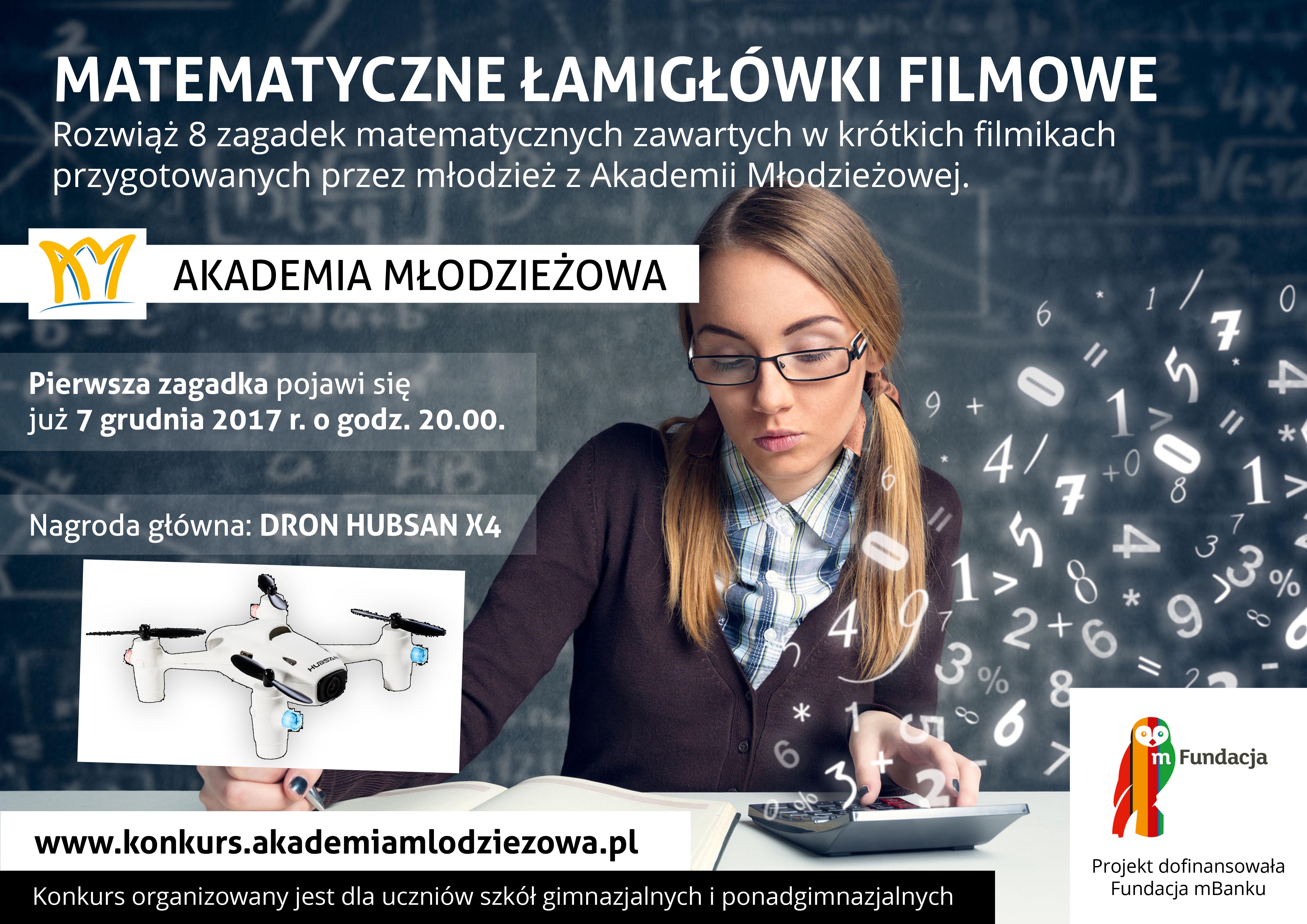 Zachęcamy serdecznie do udziału Państwa uczniów w konkursie „Matematyczne łamigłówki filmowe” organizowanym przez Akademię Młodzieżową działającą w ramach Fundacji Szczęśliwe Dzieciństwo. Jest on adresowany do wszystkich uczniów klas gimnazjalnych i ponadgimnazjalnych w wieku 13-19 lat. Celem konkursu jest wzrost wiedzy matematycznej wśród uczniów oraz propagowanie innowacyjnych metod nauczania tego przedmiotu.