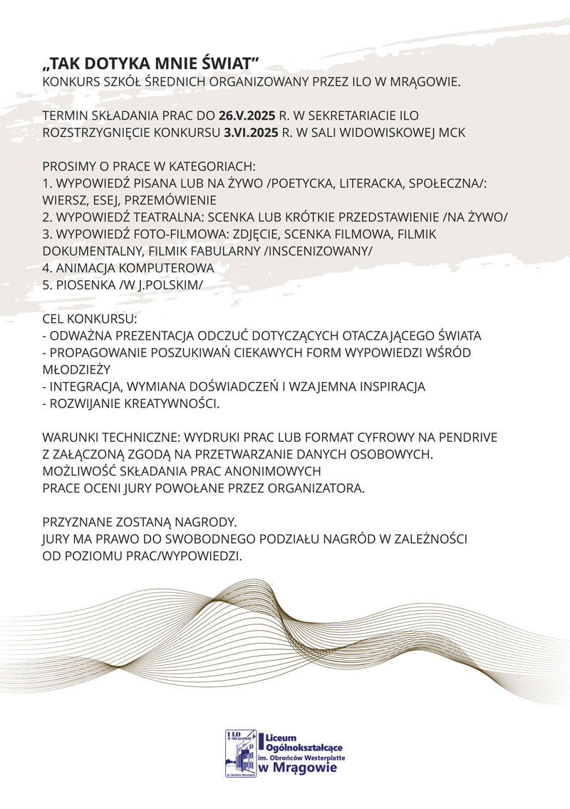 To już IV edycja tego Konkursu szkół średnich w Mrągowie, tym razem organizowanego przez nasze Liceum pod opieką pomysłodawczyni konkursu - Agnieszki Michalskiej aktorki, reżyserki, dyrektor MCK /2022-2024/.