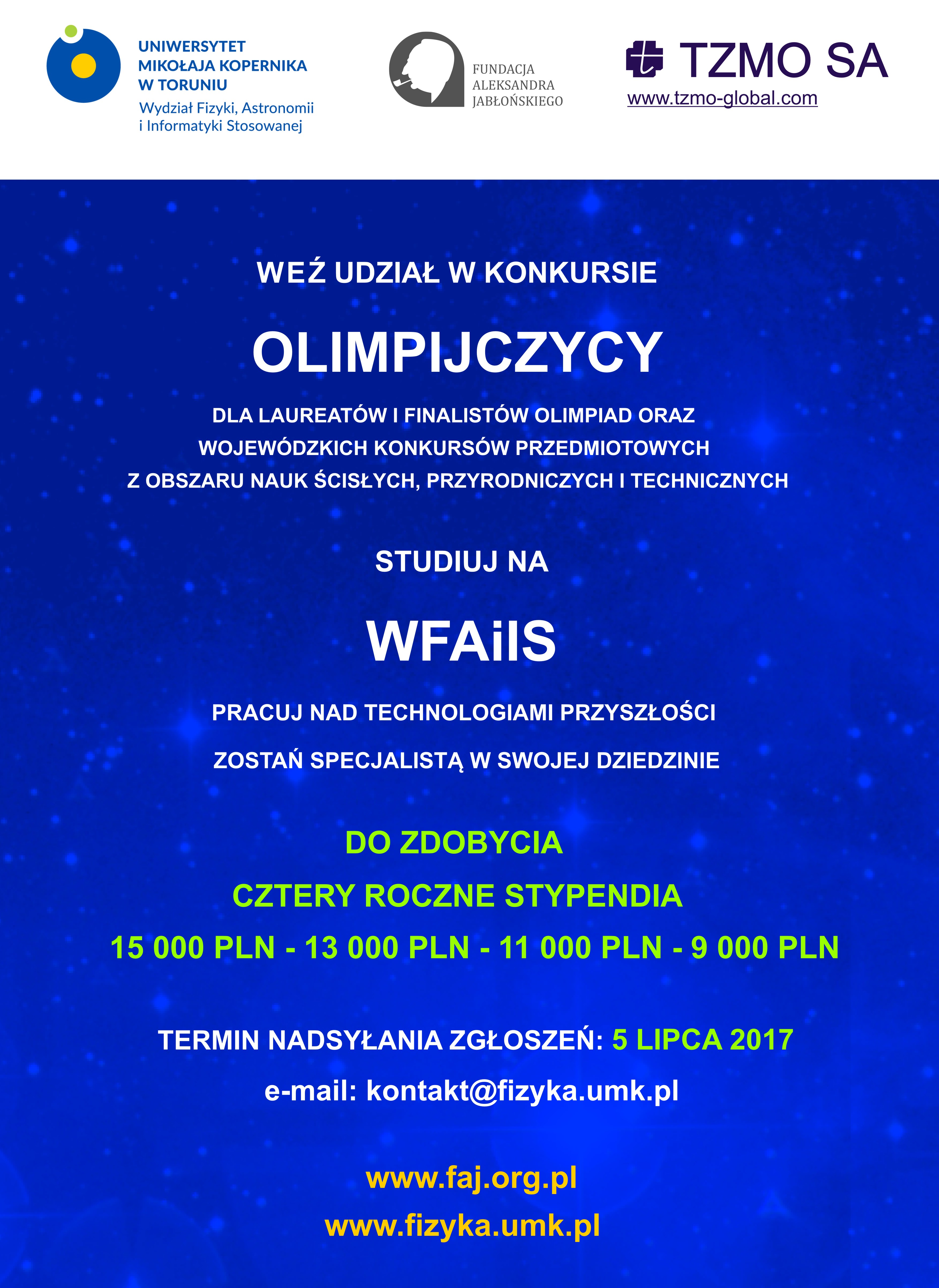 Fundacja Aleksandra Jabłońskiego ogłosiła ogólnopolski konkurs "Olimpijczycy" dla uczniów szkół ponadgimnazjalnych, którzy chcą studiować na Wydziale Fizyki, Astronomii i Informatyki Stosowanej Uniwersytetu Mikołaja Kopernika w Toruniu. Do zdobycia są 4 stypendia ufundowane przez Fundację oraz Toruńskie Zakłady Materiałów Opatrunkowych SA. Szczegóły na plakacie w załączniku oraz na stronie internetowej FAJ (http://www.faj.org.pl).